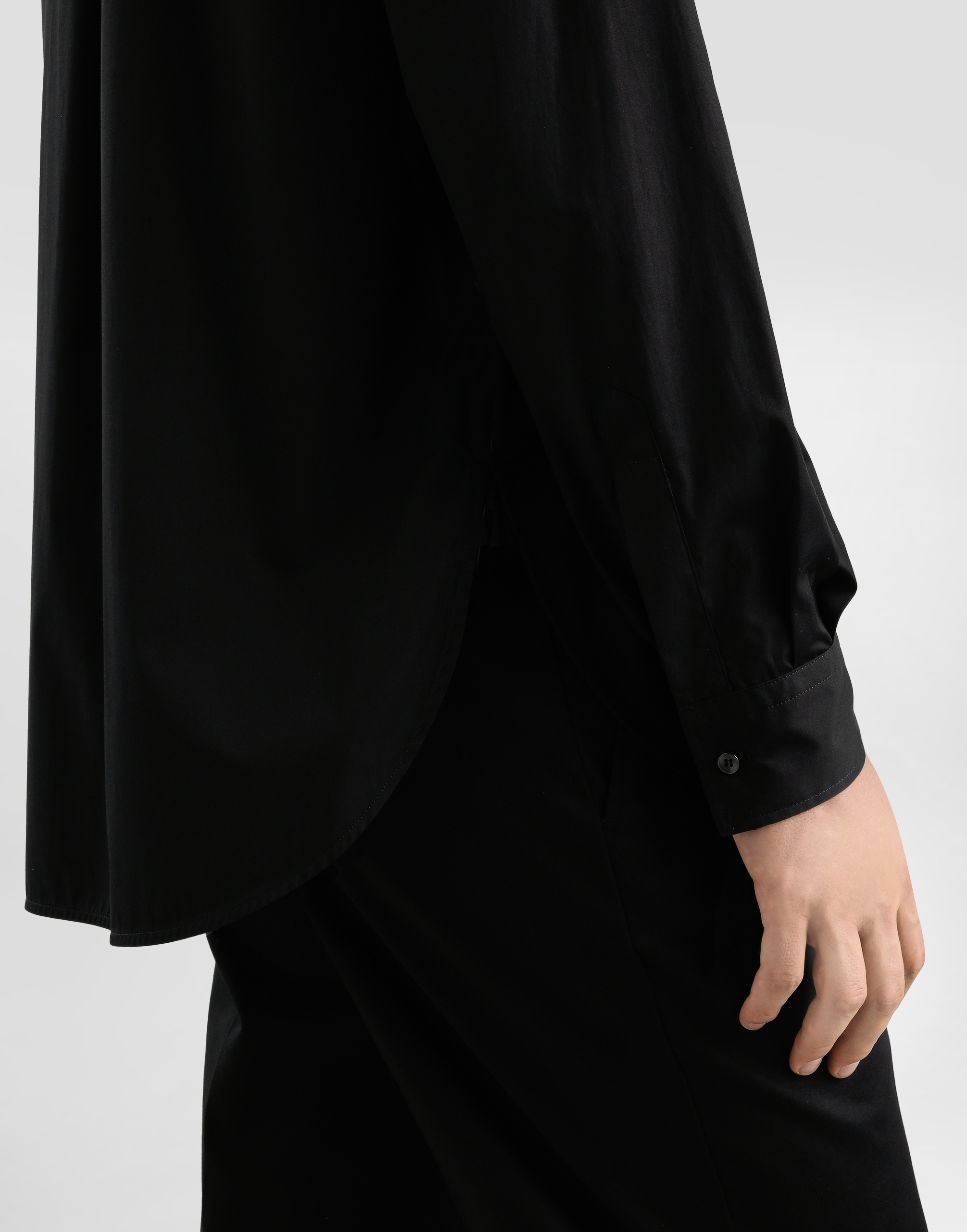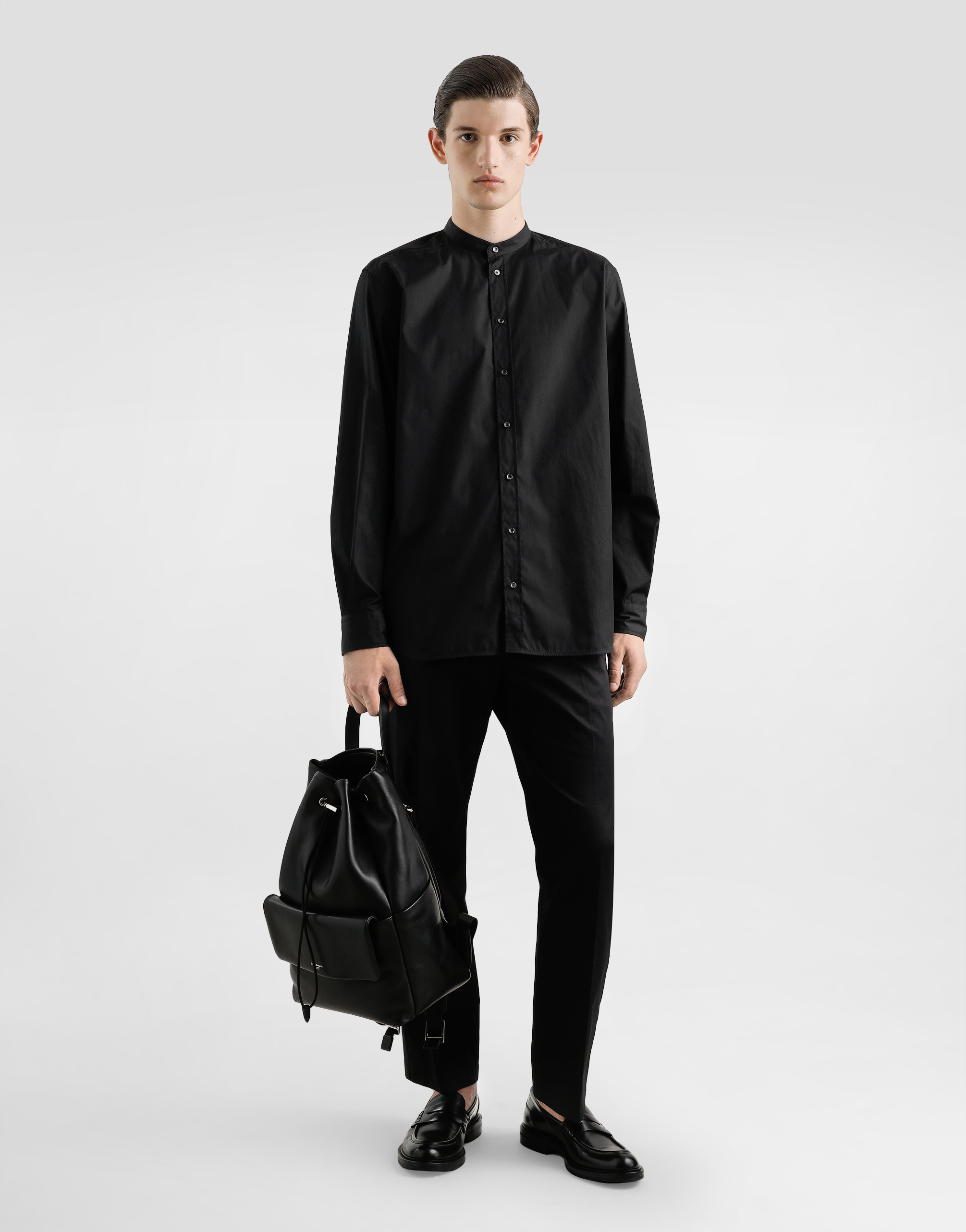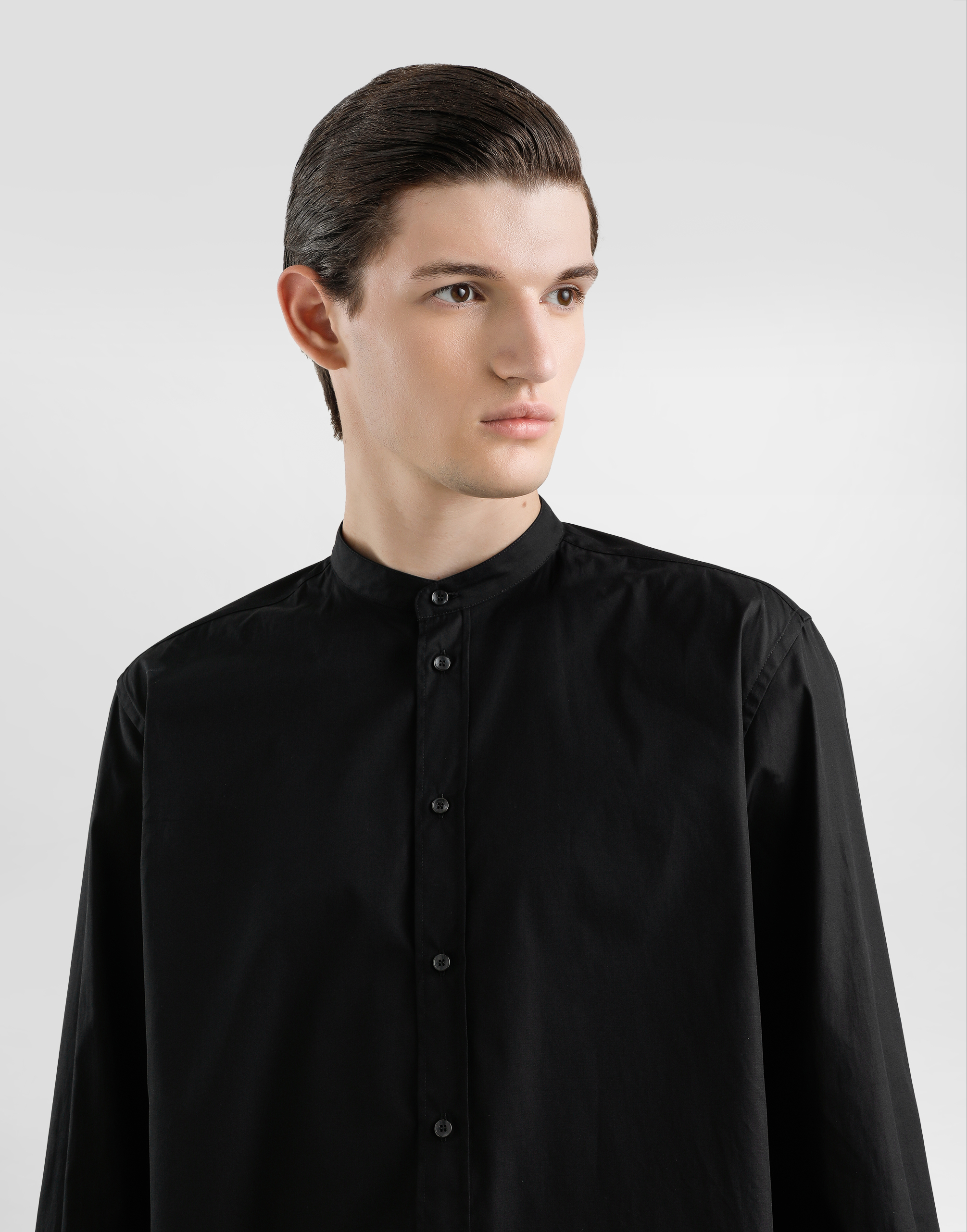 Хлопковая рубашка: • Черная • Прямой крой • Воротник-стойка • Длинные рукава • Застежка на пуговицы • Длина изделия от шва воротника сзади - 83 см (размер IT 40) • Сделано в Италии