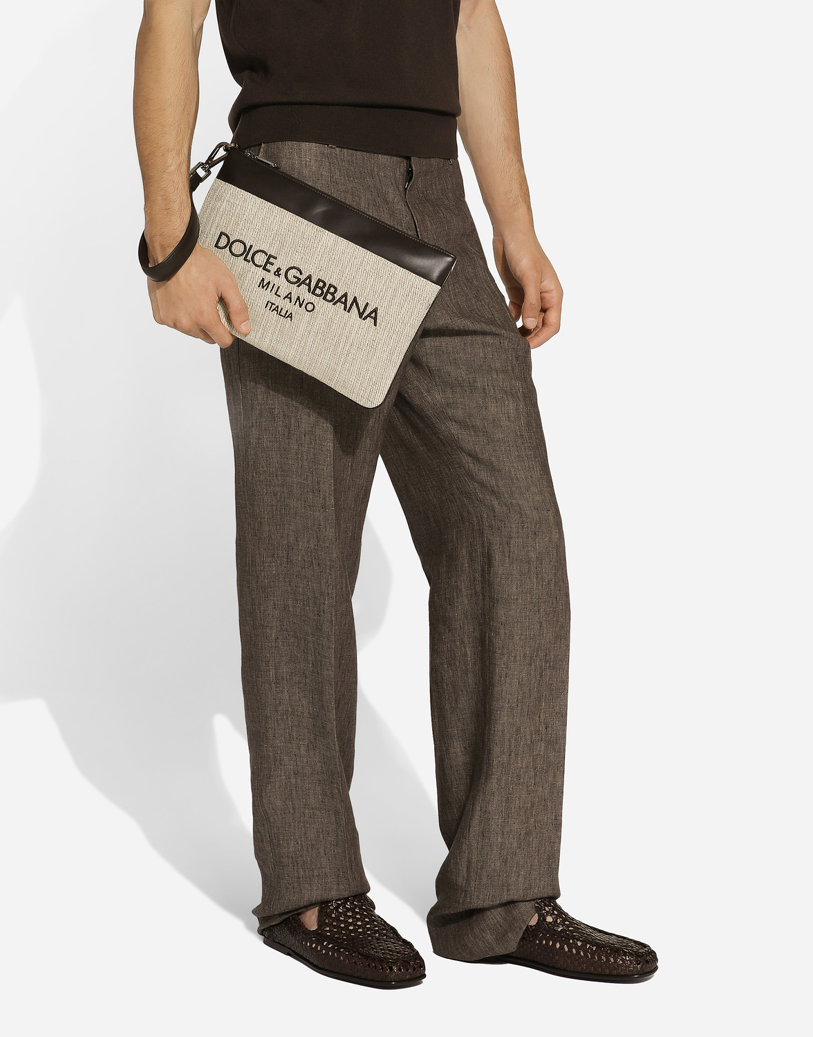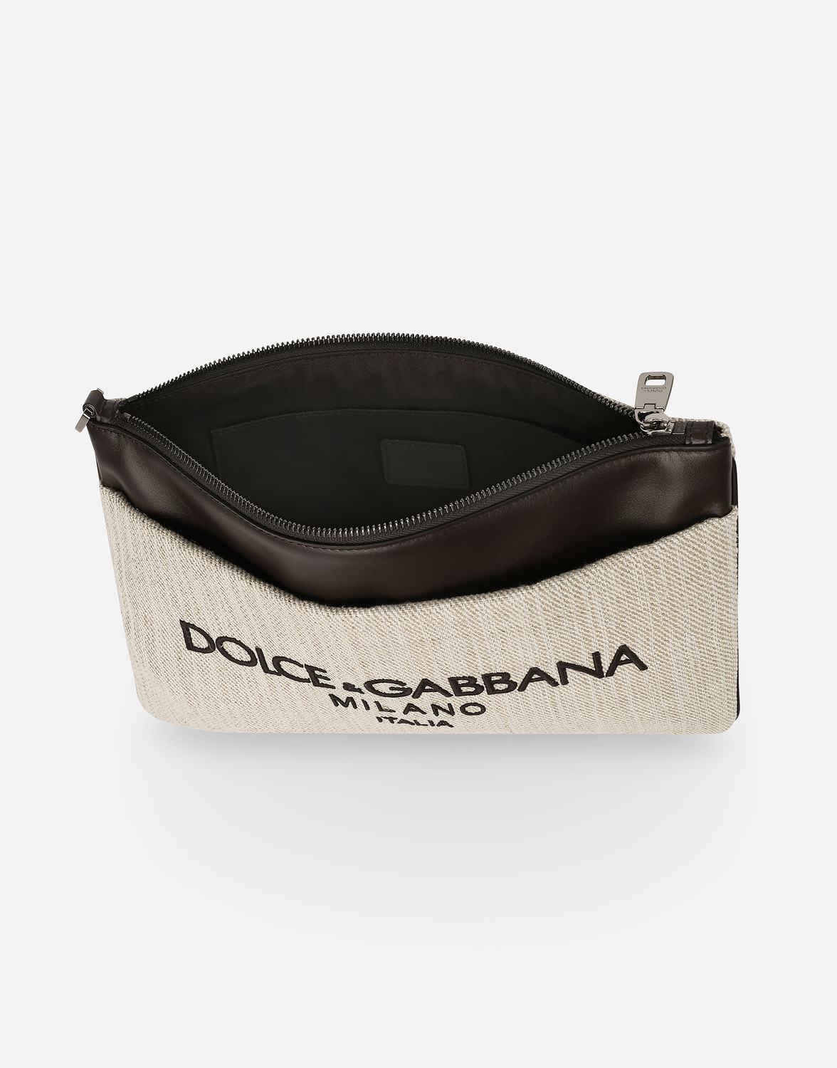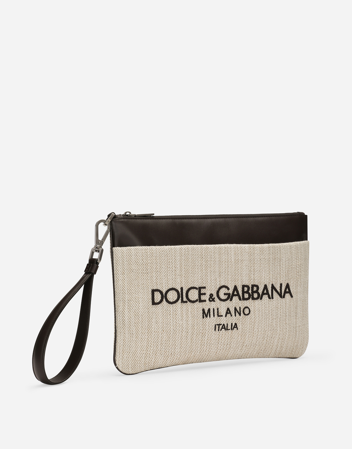Практичный и компактный, этот клатч выполнен из канвы с деталями из телячьей кожи и украшен вышитым логотипом Dolce & Gabbana Milano.