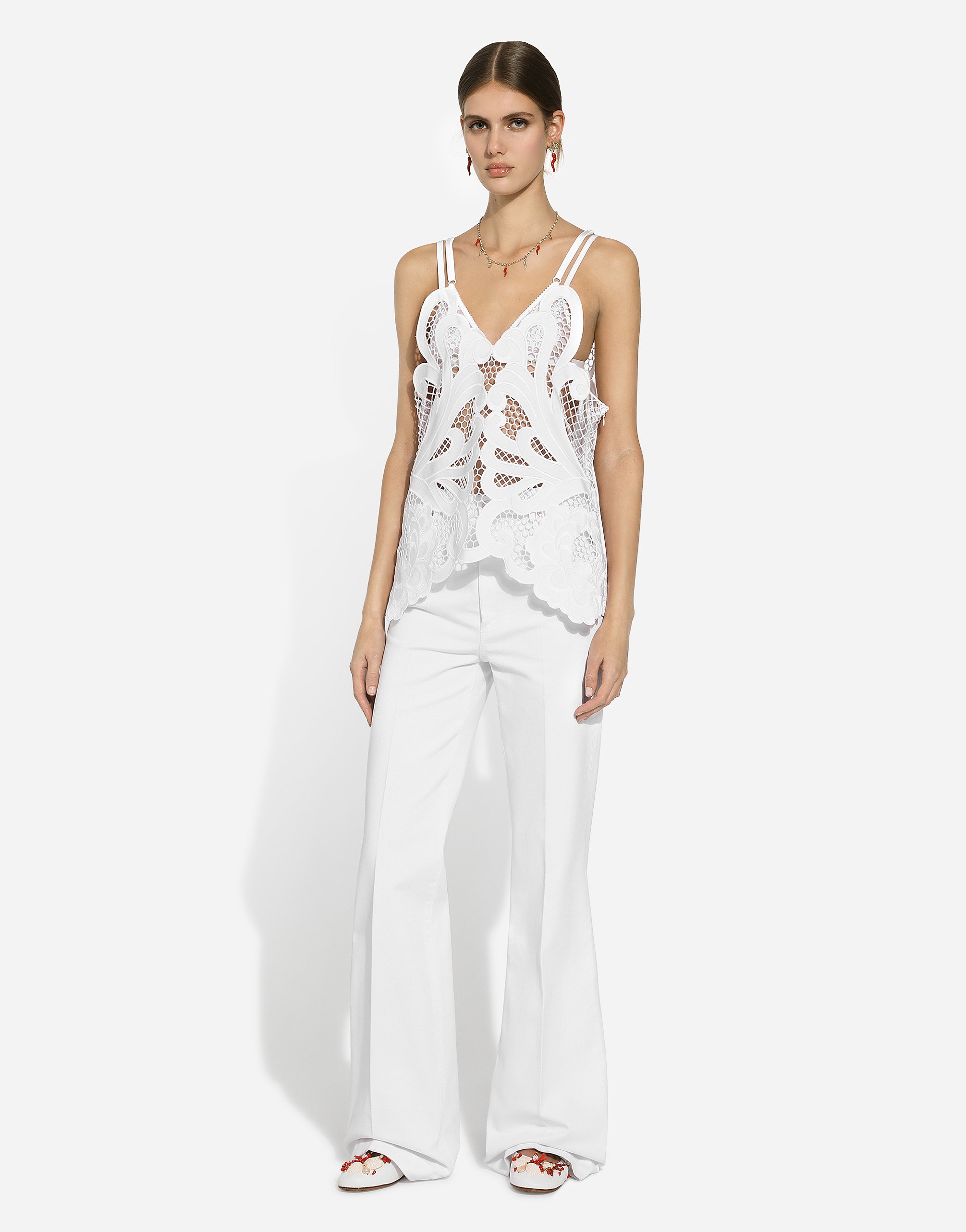 Топ из хлопка с прорезными деталями: • Белый • Прямой вырез горловины • Без рукавов, на бретелях • Без подкладки • Боковая застежка на молнию и крючок • Длина изделия от середины спины - 34,5 см для размера IT 40 • Рост модели - 175 см, на ней размер IT 40 • Сделано в Италии