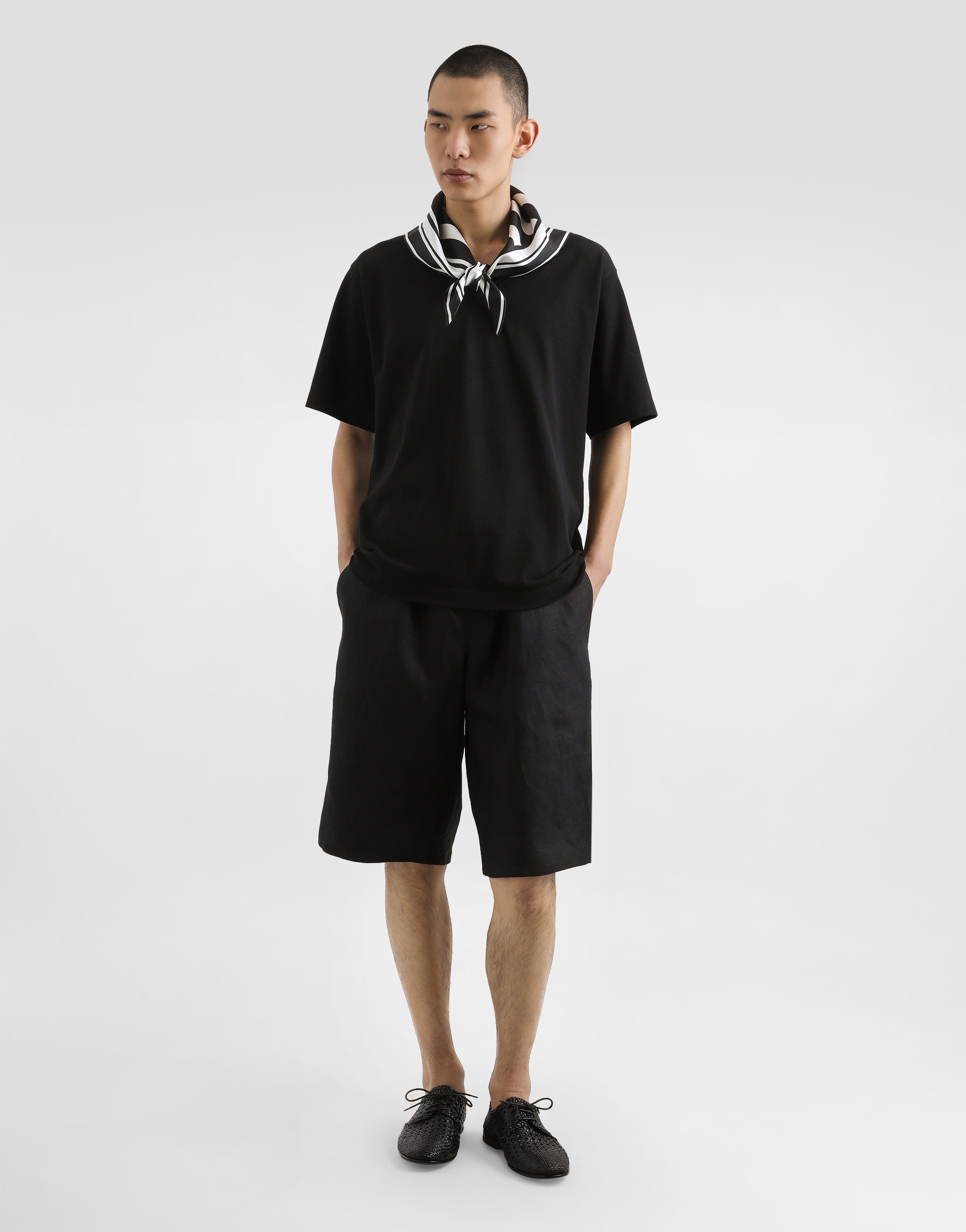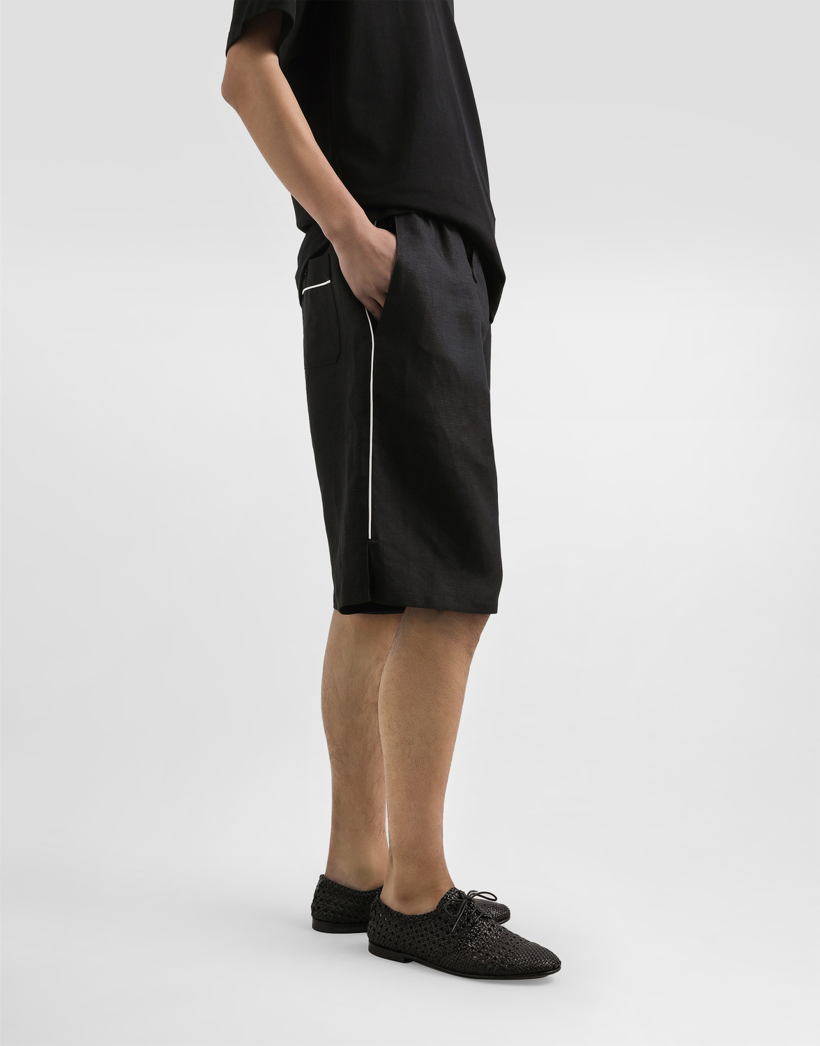 Шорты из льняной ткани: • Черные • Обычный крой • Эластичный пояс со шнурком • Боковые карманы с косым входом и накладной карман сзади на пуговице • Длина изделия по внешнему шву - 58 см, ширина низа - 32 см для размера IT 48 • Сделано в Италии