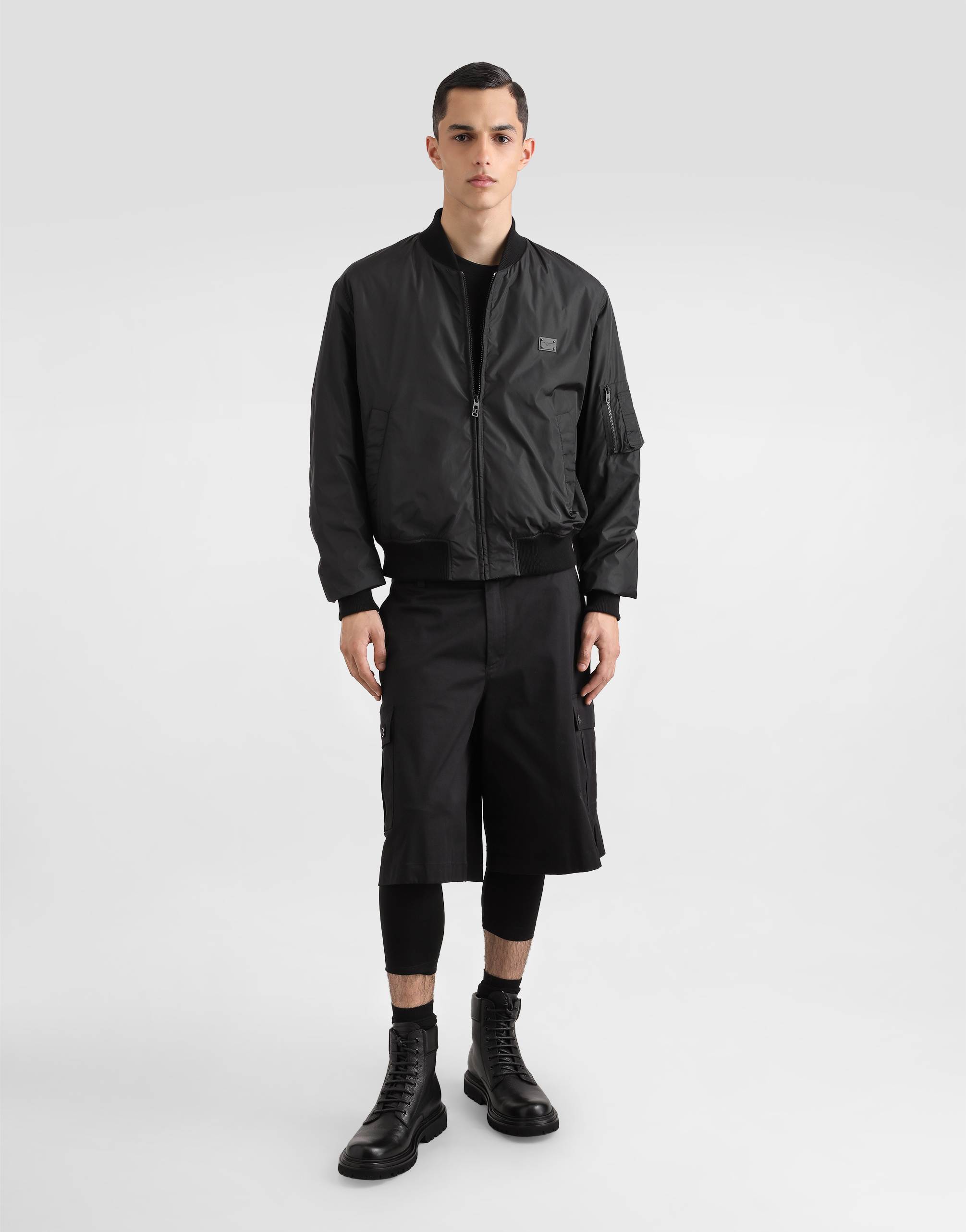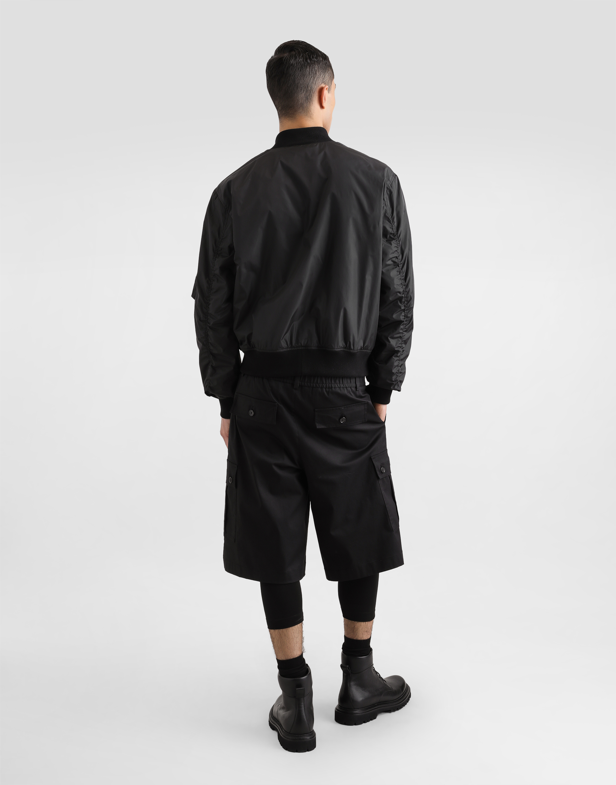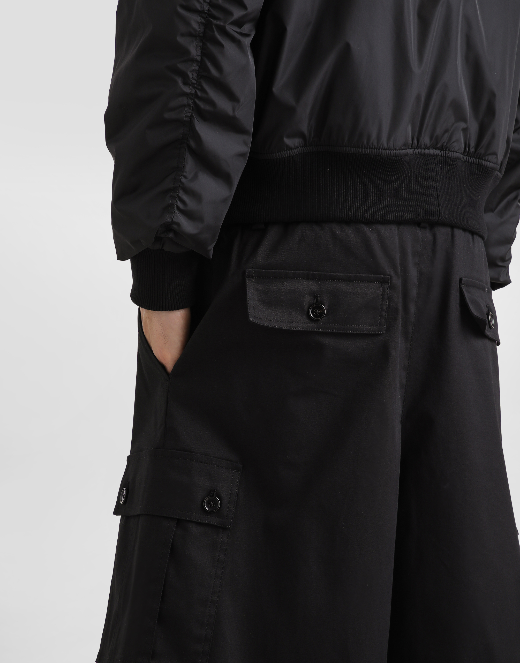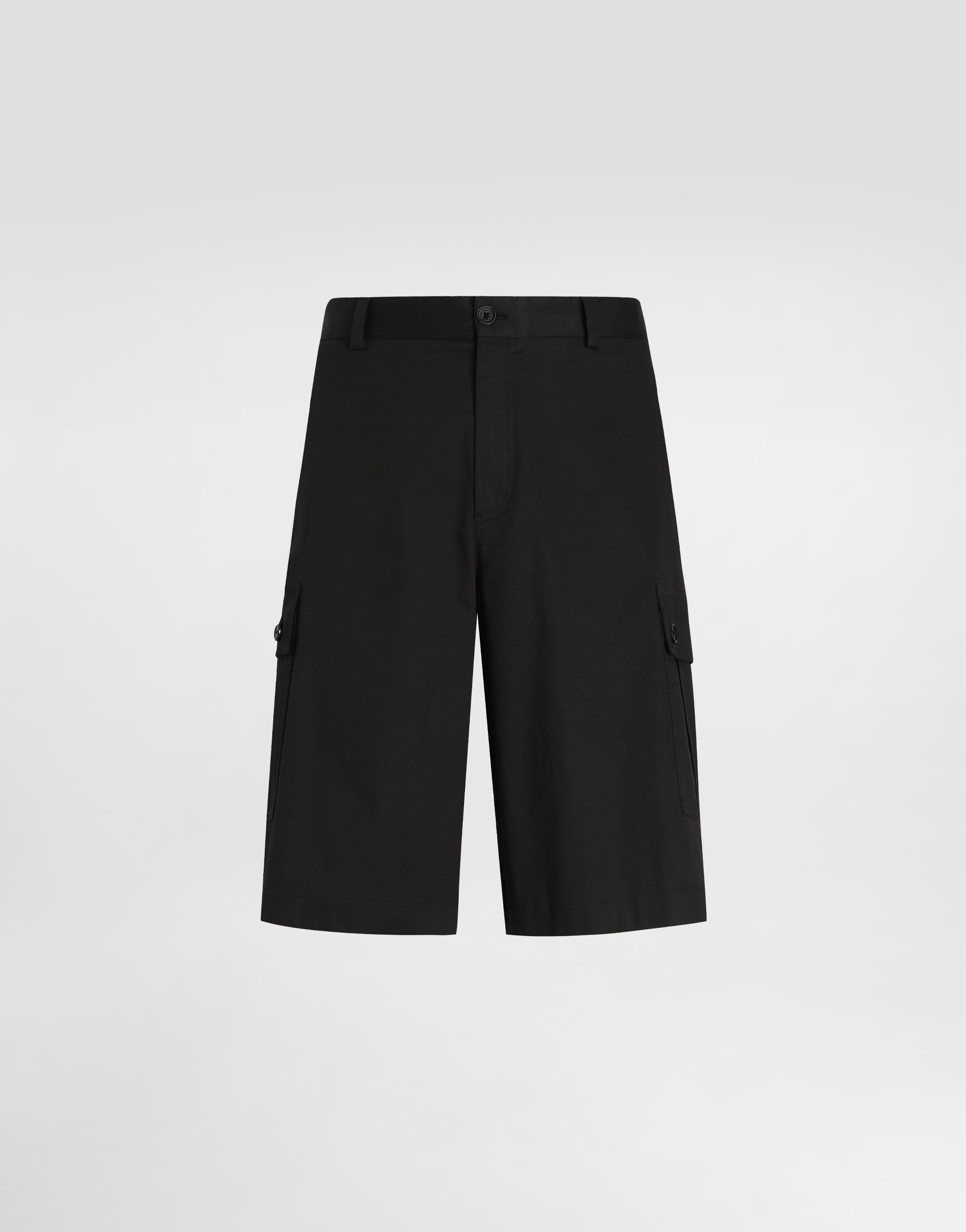 Шорты-карго из хлопковой габардины: • Черные • Прямой крой • Потайная застежка на молнию и пуговицу, с эластичной вставкой сзади • Передние косые карманы, задний карман и боковые карманы • Длина изделия по внешнему шву - 62 см, ширина низа - 38 см для размера IT 48 • Сделано в Италии