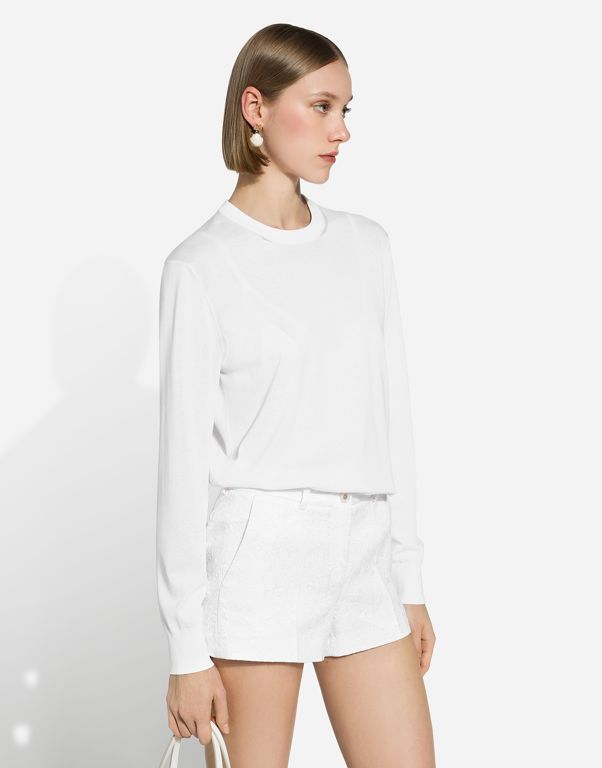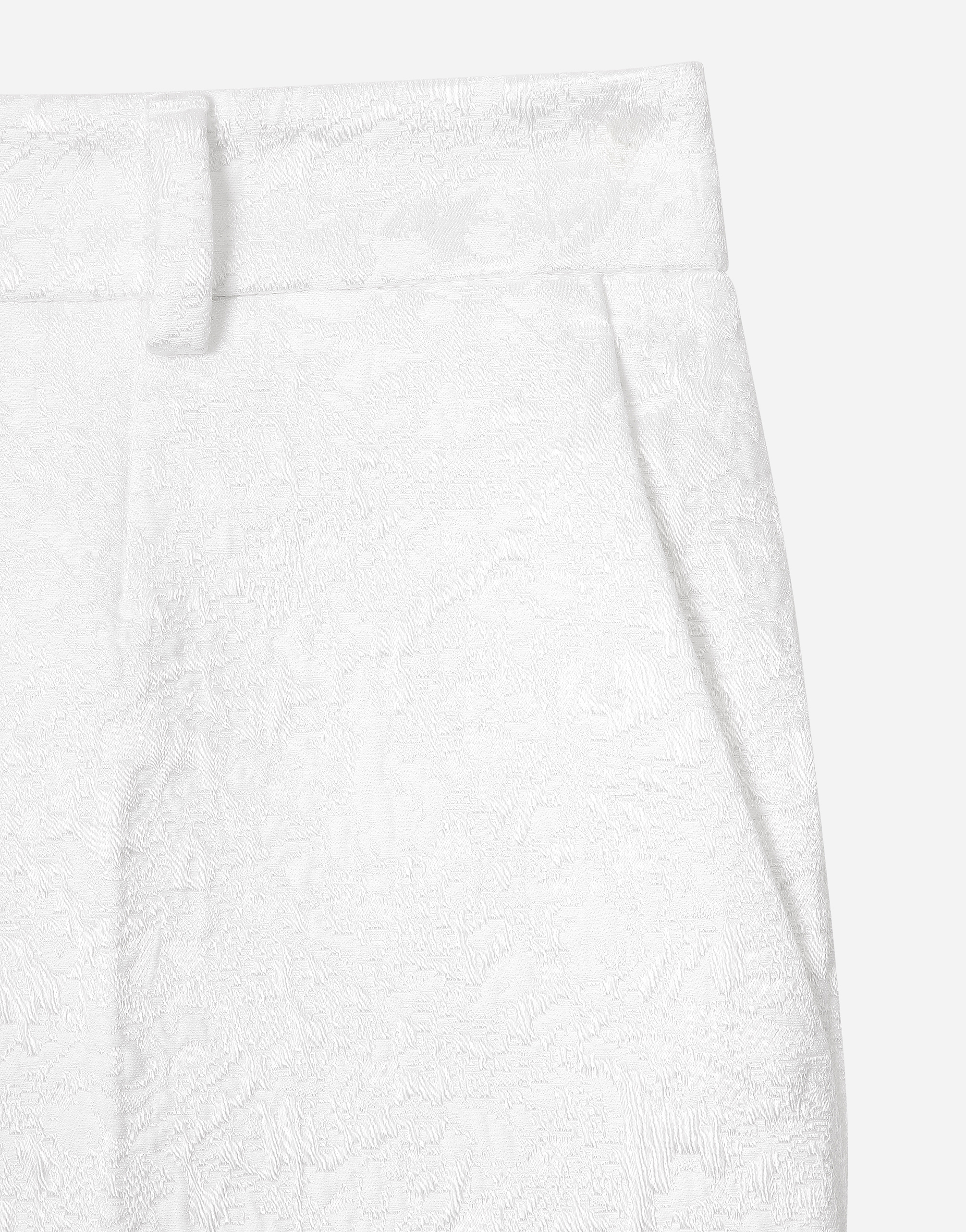 Брюки-шорты из брокарда: • Белый цвет • Средняя посадка • Косые карманы • Длина по внутреннему шву: 6,5 см • Ширина низа: 33 см • Застежка на молнию и пуговицу • Модель ростом 175 см, размер IT 40 • Сделано в Италии