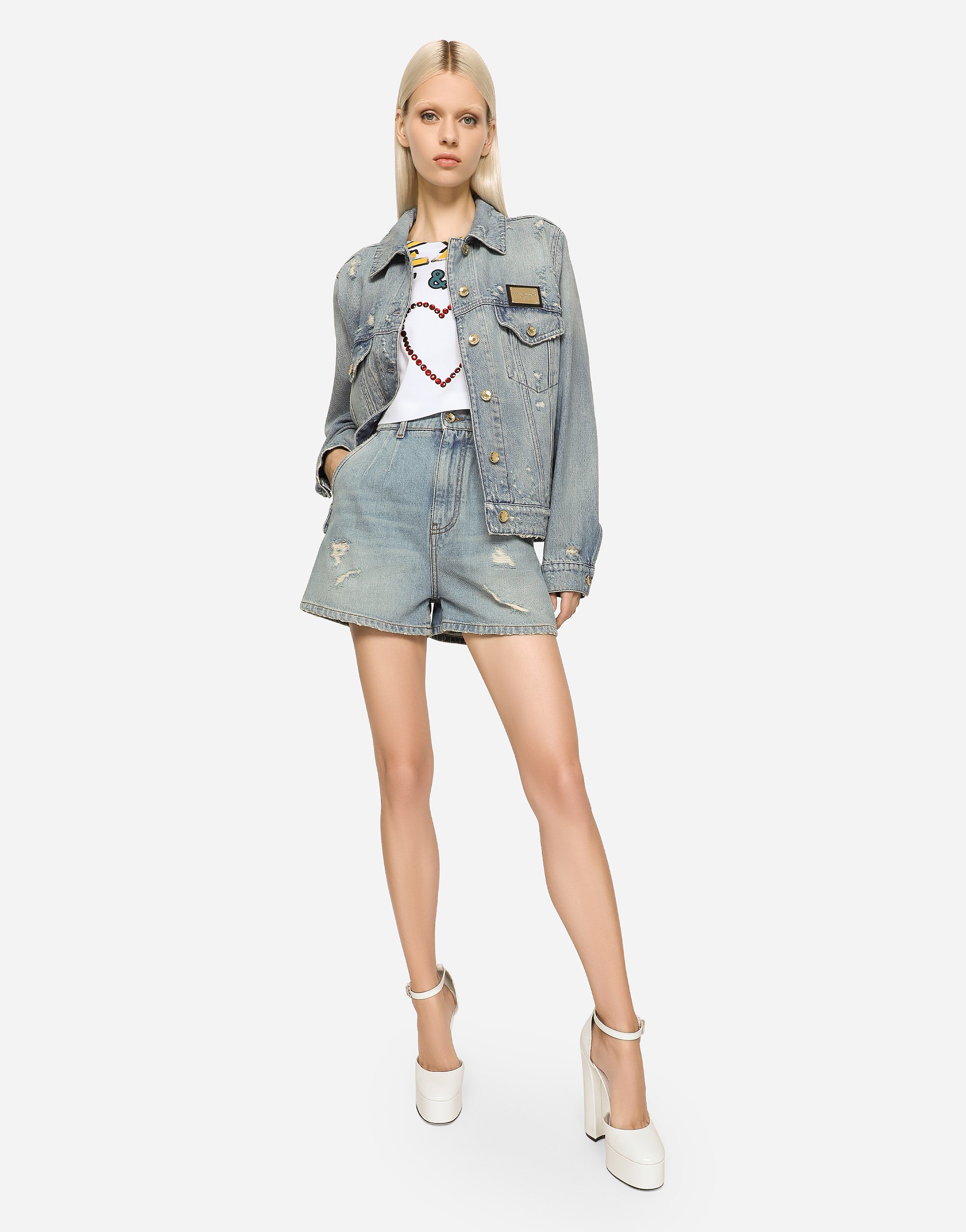 Джинсовые шорты с завышенной талией: • Белые • Завышенная талия • 5 карманов • Фирменная нашивка на монетном кармане • Ярлык с логотипом • Низ: 31 см • Застежка-молния и фирменная металлическая пуговица спереди • Модель имеет рост 175 см и носит размер IT 40 • Сделано в Италии Различие в расположении принта, которое вы можете обнаружить на этом изделии, является особенностью изделий Dolce & Gabbana «Handmade». Деталь, которая делает каждый предмет одежды или аксессуар уникальным и эксклюзивным.