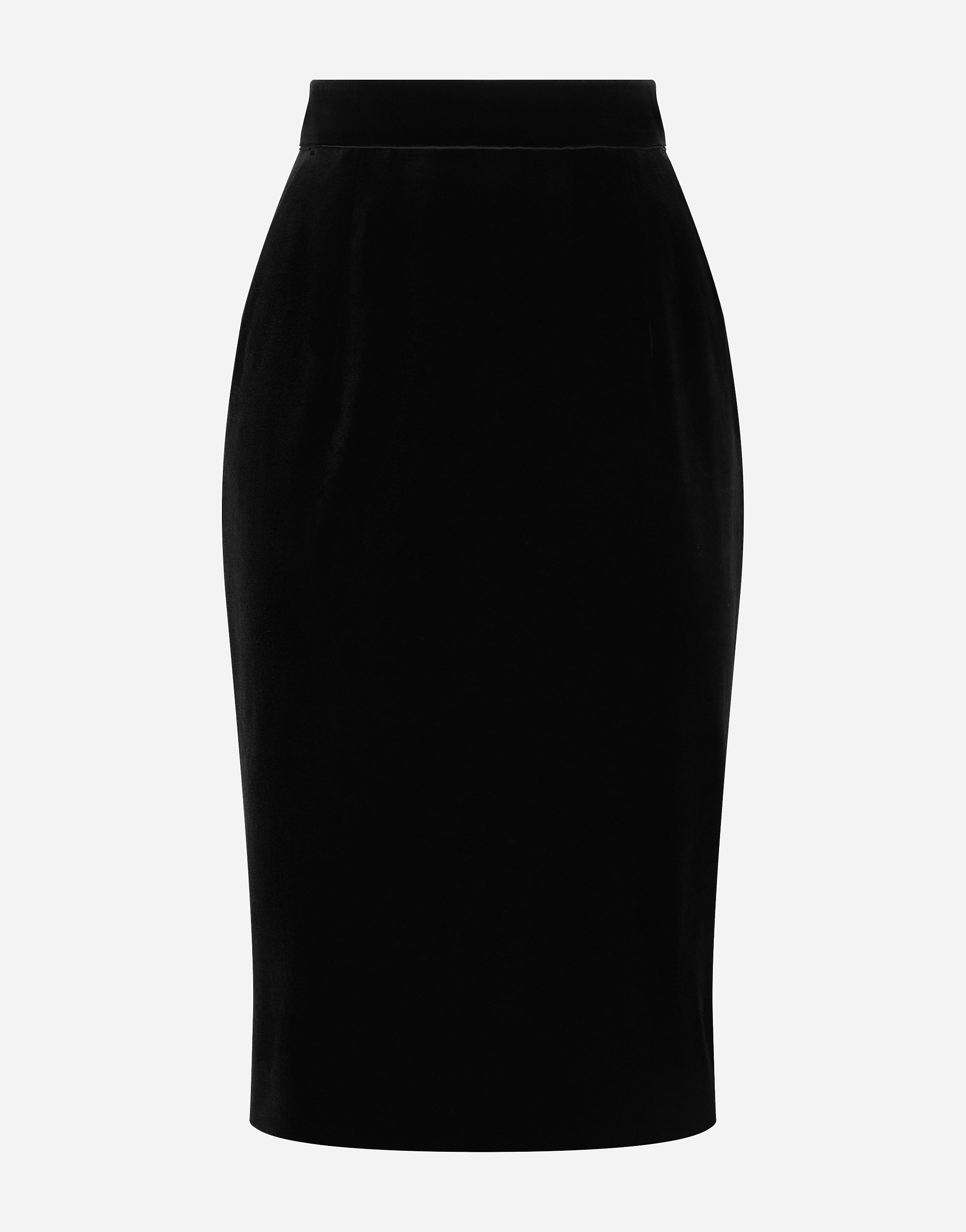 Бархатная миди-юбка-карандаш: • Черная • С завышенной талией • Прорезные задние карманы с атласными пуговицами • Без подкладки • Задняя застежка на молнию и крючок • Длина изделия от талии - 66,5 см для размера IT 40 • Модель - 175 см, размер IT 40 • Сделано в Италии