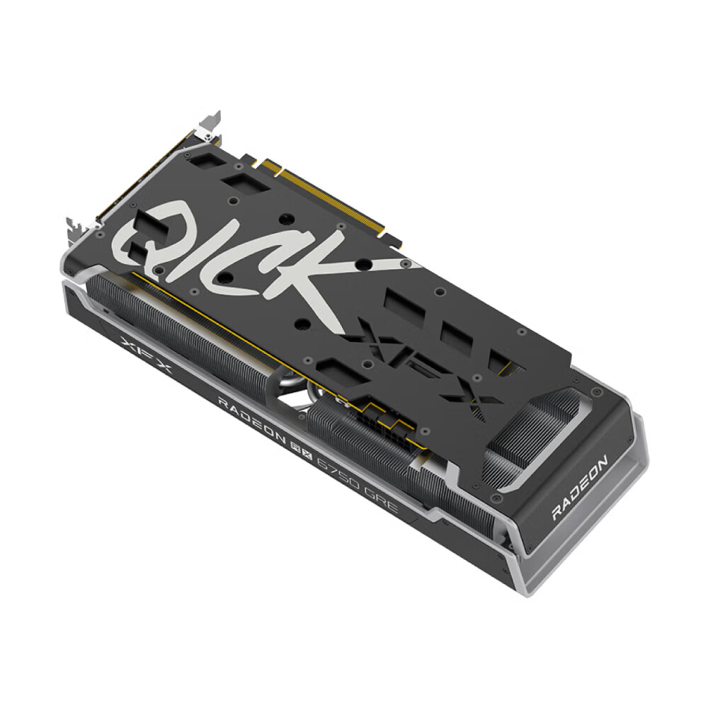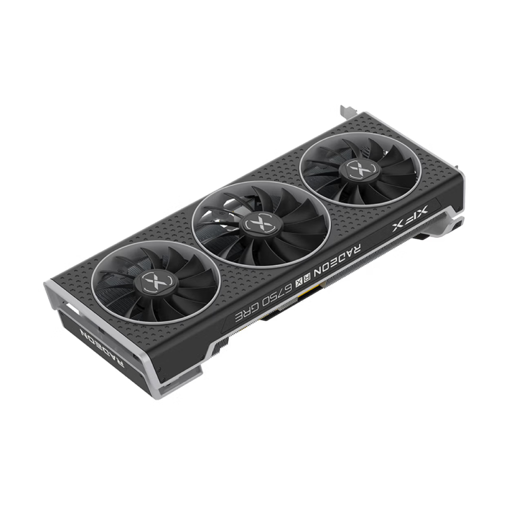 Фирменная видеокарта Radeon RX 6750 GRE от бренда XFX. Модель Overseas Edition имеет длину 323 мм, черный кожух и три 13-лопастных осевых вентилятора для обдува радиатора с тепловыми трубками. Видеокарта XFX Radeon RX 6750 GRE Overseas Edition оснащена 12 ГБ 192-битной видеопамятью 16 Гбит/с.
