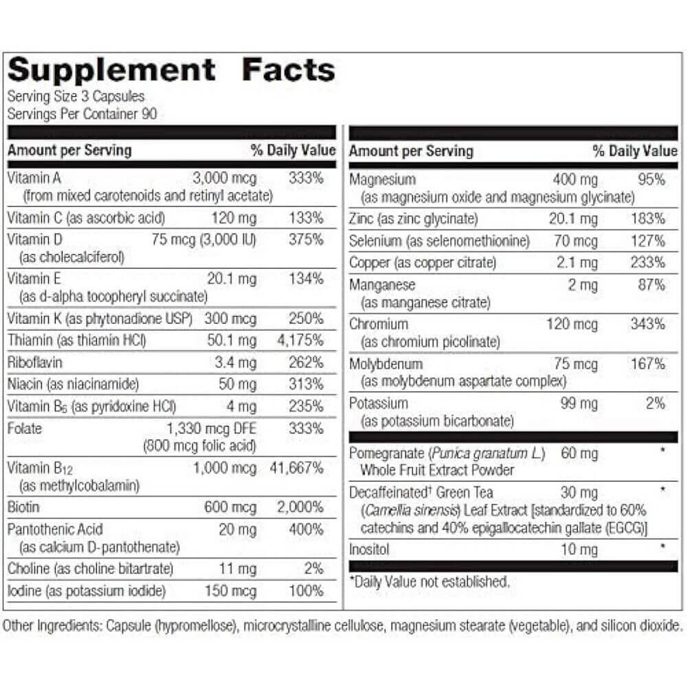 Витамин А, витамин С, витамин D, витамин Е, витамин К, тиамин, рибофлавин, ниацин, витамин В6, фолиевая кислота, витамин В12, биотин, пантотеновая кислота, йод, магний, цинк, селен, медь, марганец, хром, молибден, калий, зеленый чай без кофеина, гранат, холин, инозитол.