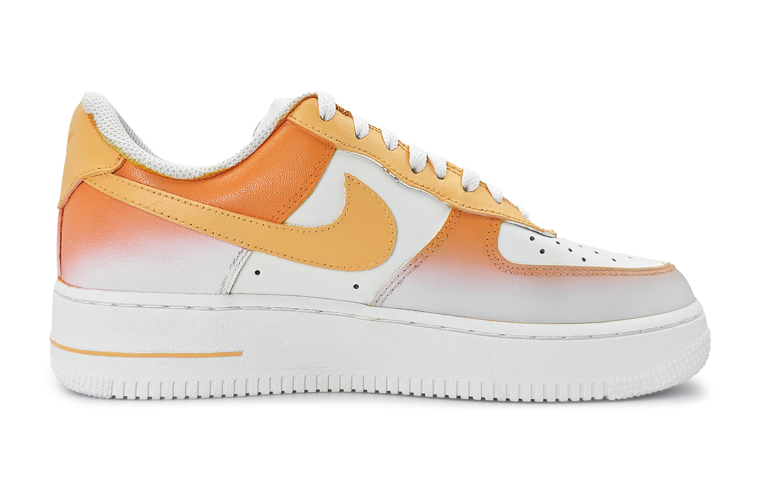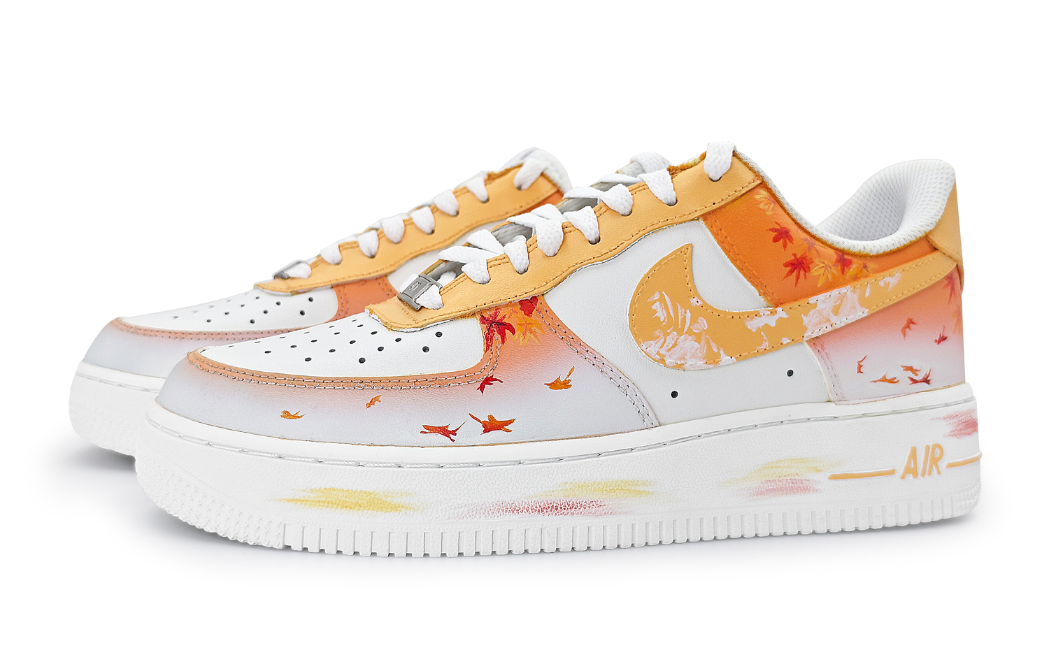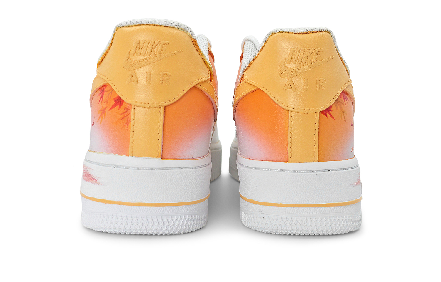 Эти кастомные кроссовки созданы на основе оригинальных Nike Air Force 1. Концепция дизайна вдохновлена градиентом белого, светло-оранжевого и теплого красного цветов на корпусе обуви, что соответствует цветовому переходу опавших листьев от раннего желтого (нежные желтые кленовые листья, падающие ранней осенью) до темно-красного (зрелые красные листья поздней осени), воссоздавая визуальную текстуру «слоев цвета» опавших листьев в лесу.
