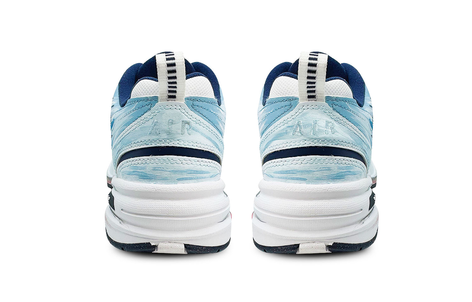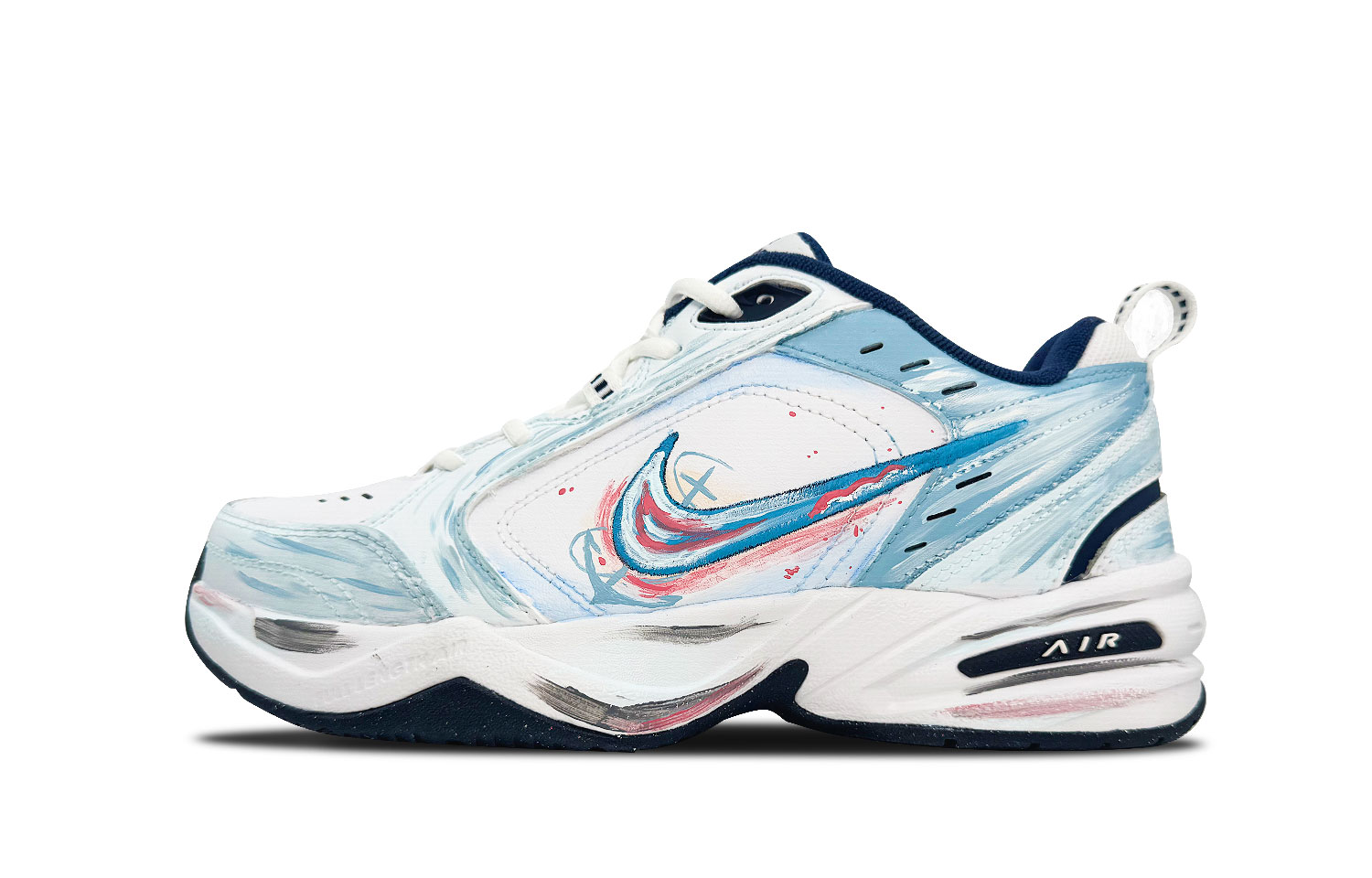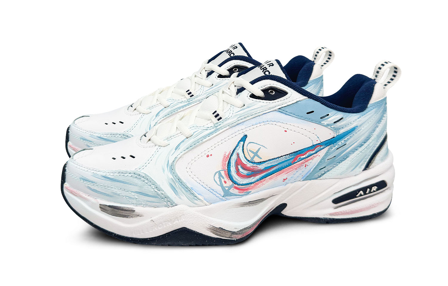 Эти кроссовки, созданные на основе оригинальной модели Nike Air Monarch 4 Retro Classic Non-Slip Low Top Dad Shoe в сине-белом цвете, изготовлены из ткани и кожи. Артикул оригинальной модели - 415445-102. Дизайн вдохновлен морскими волнами и якорями, а цвета очень яркие.