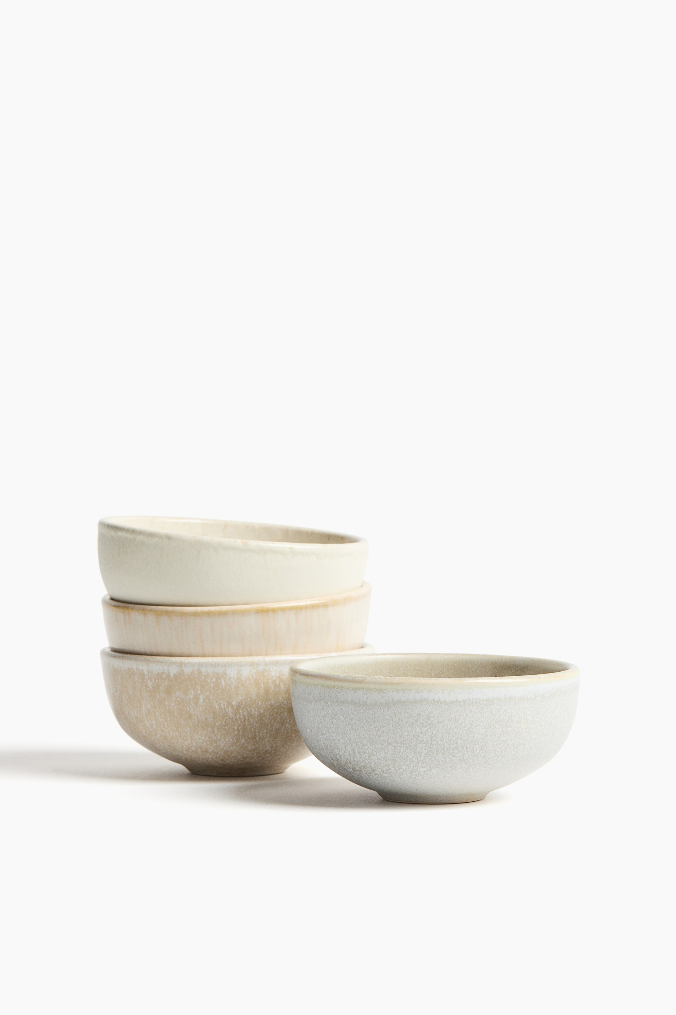 Четыре керамические миски классической формы, выполненные вручную. Поверхность покрыта реактивной глазурью, которая создает красивые, разнообразные цвета, придавая каждому изделию неповторимый вид.