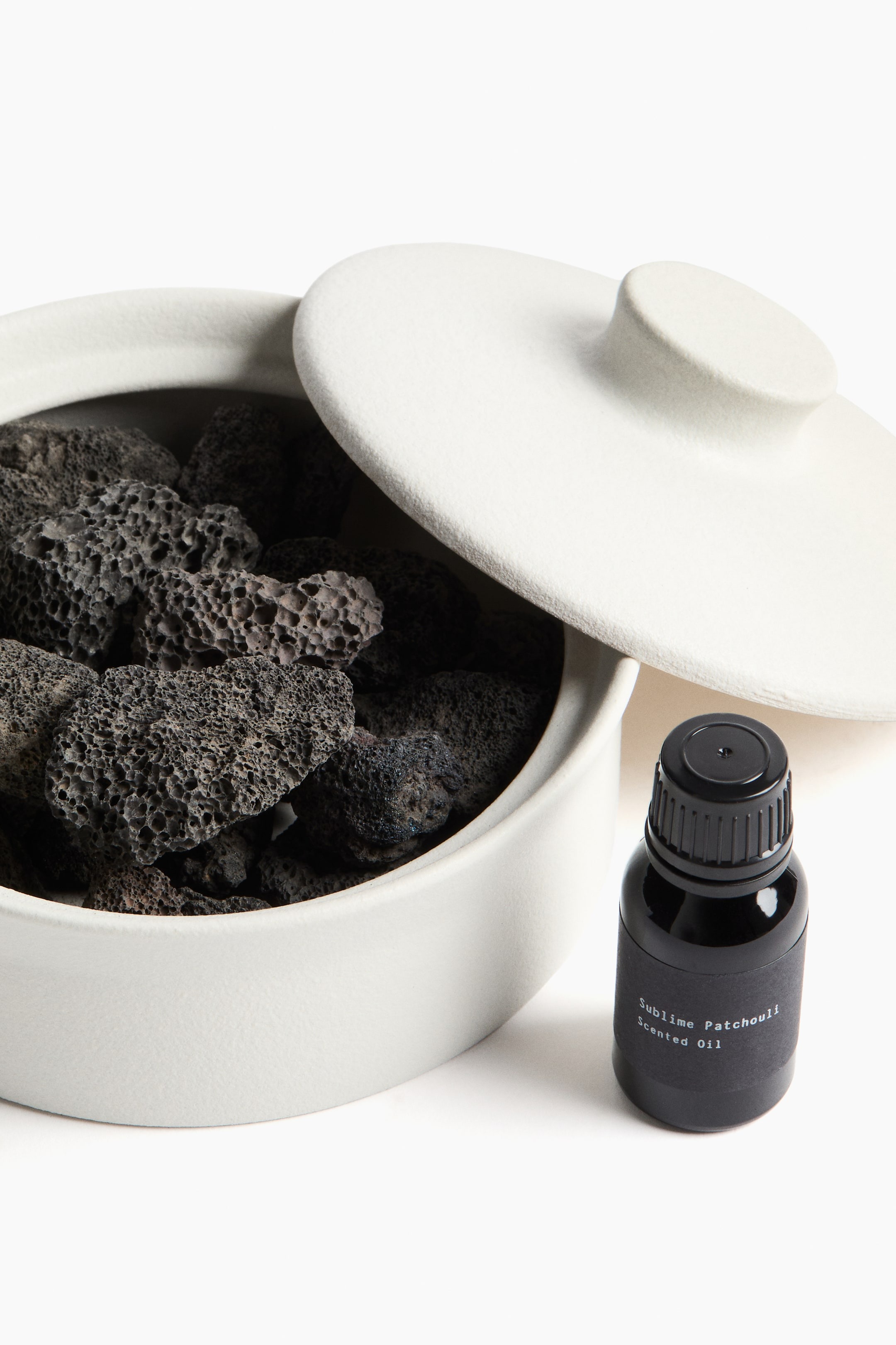 Этот аромадиффузор состоит из керамического контейнера с крышкой, наполненного вулканическими лавовыми камнями, и небольшого флакона с ароматическим маслом.