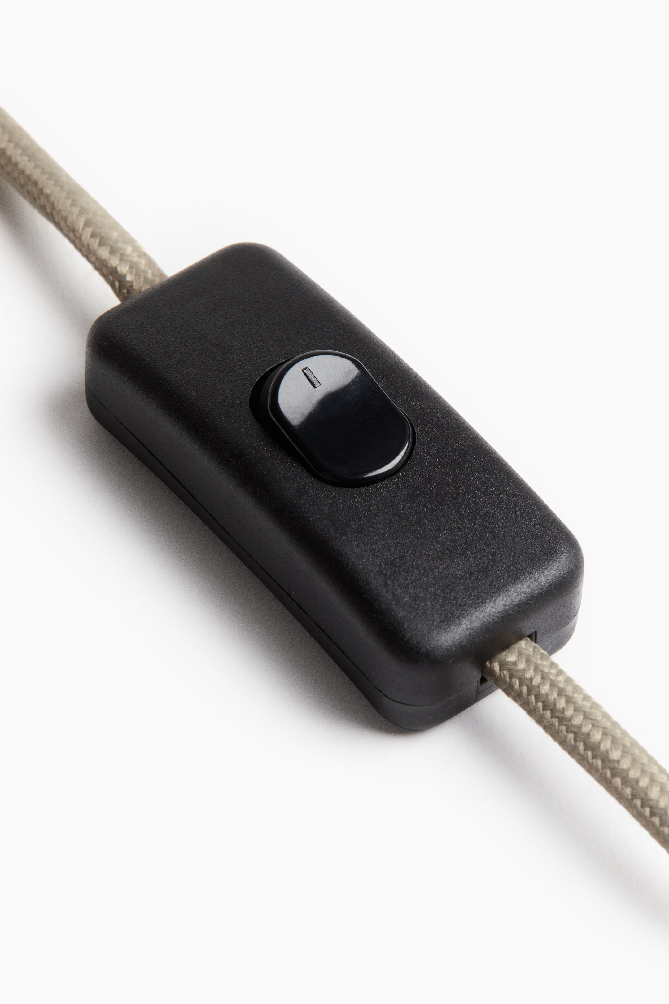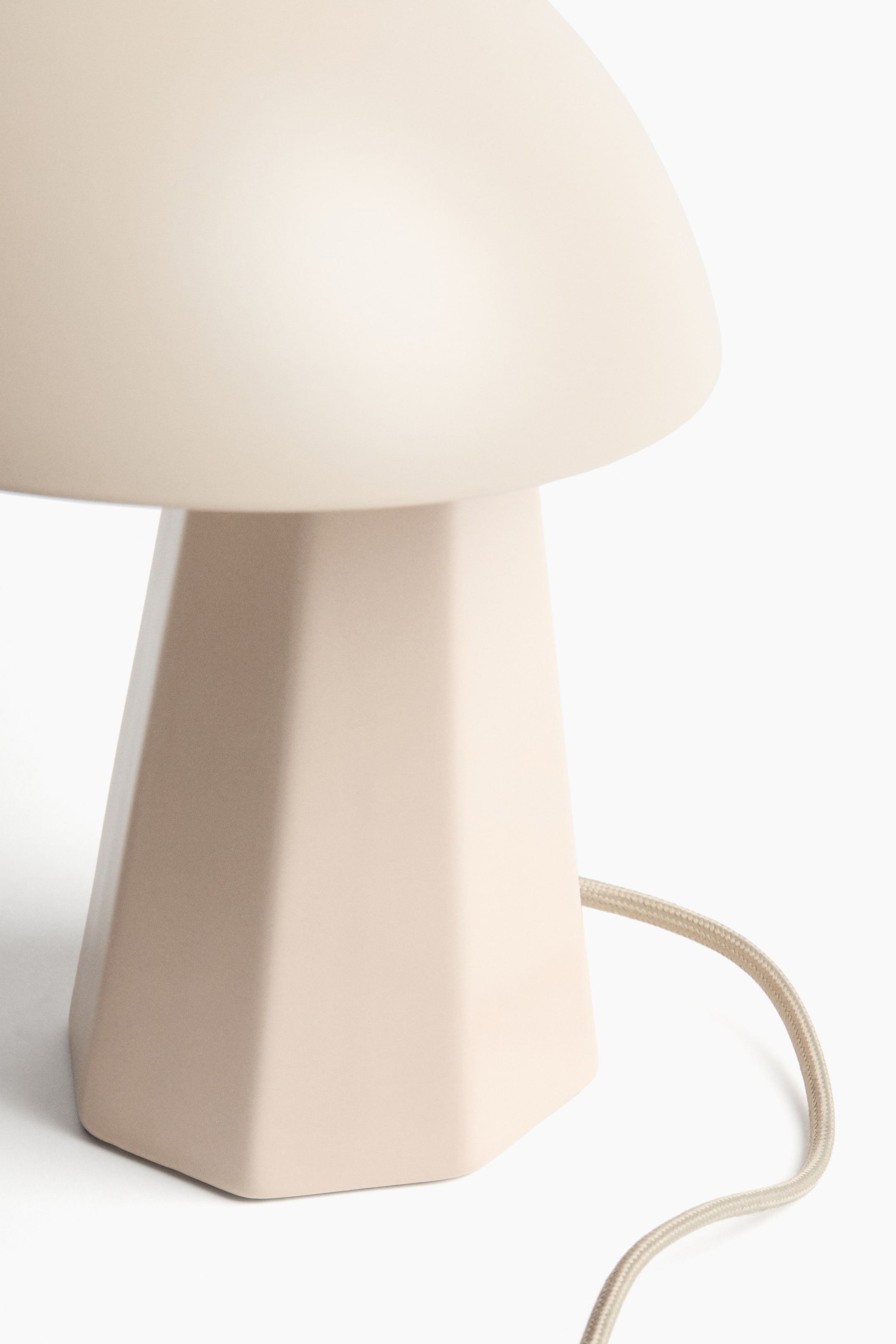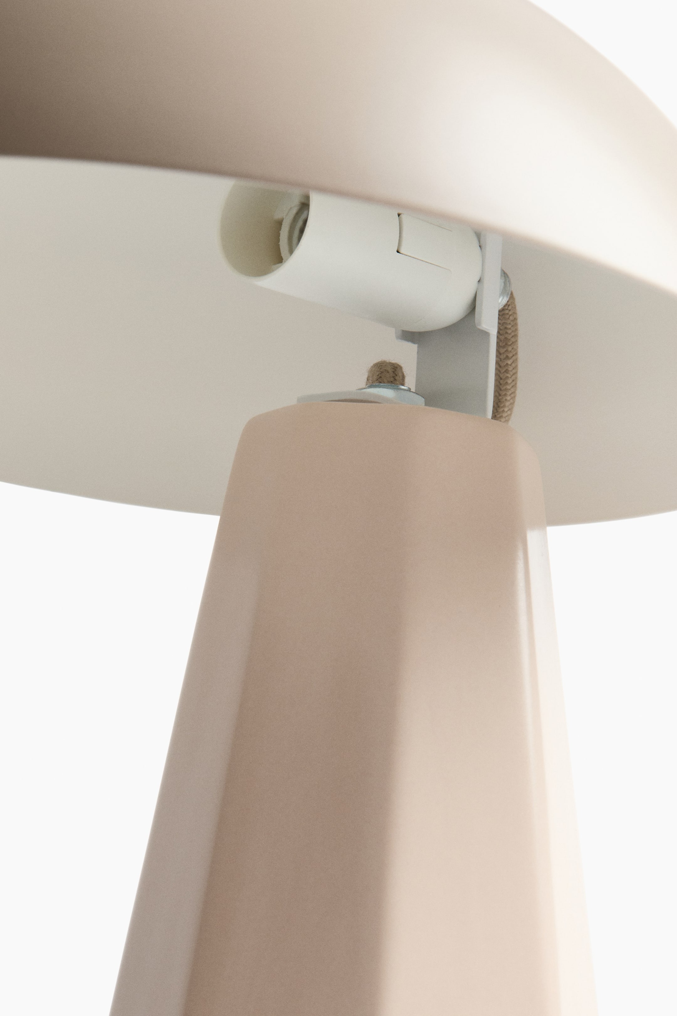 Настольная лампа с геометрическим основанием из керамики и угловым закругленным лакированным металлическим абажуром. Шнур в тканевой оплетке с пластиковым выключателем.