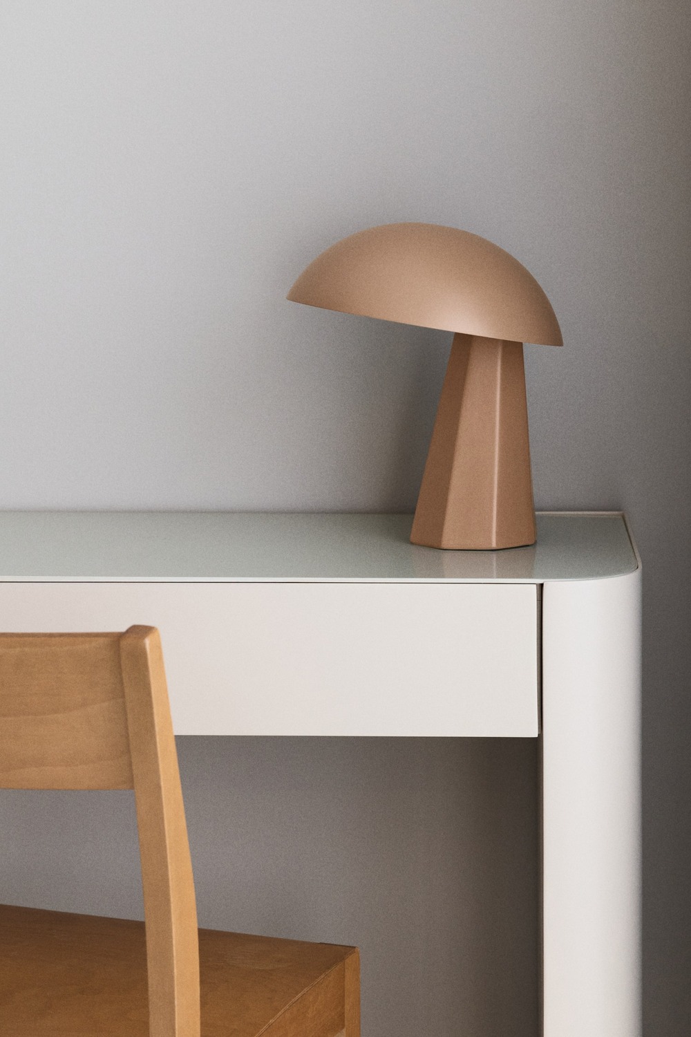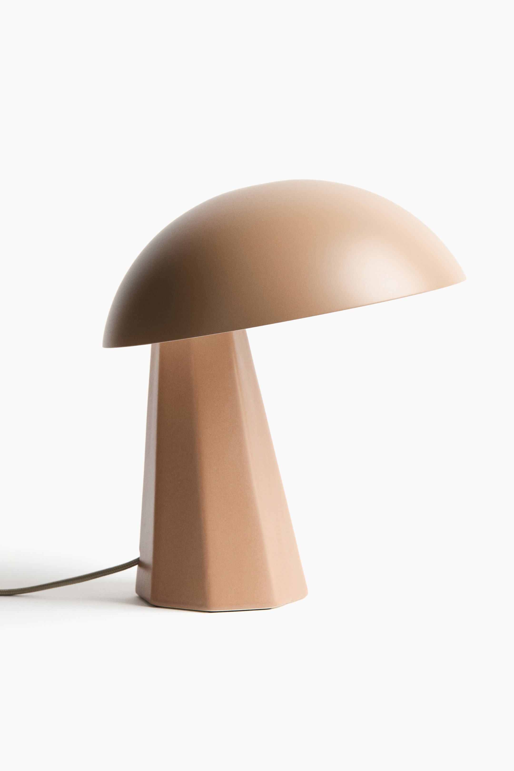 Настольная лампа с геометрическим основанием из керамики и угловым закругленным лакированным металлическим абажуром. Шнур в тканевой оплетке с пластиковым выключателем.