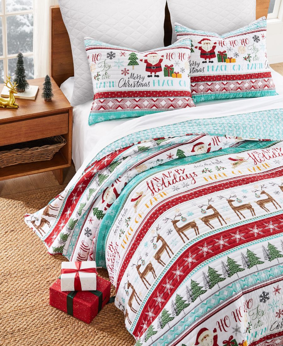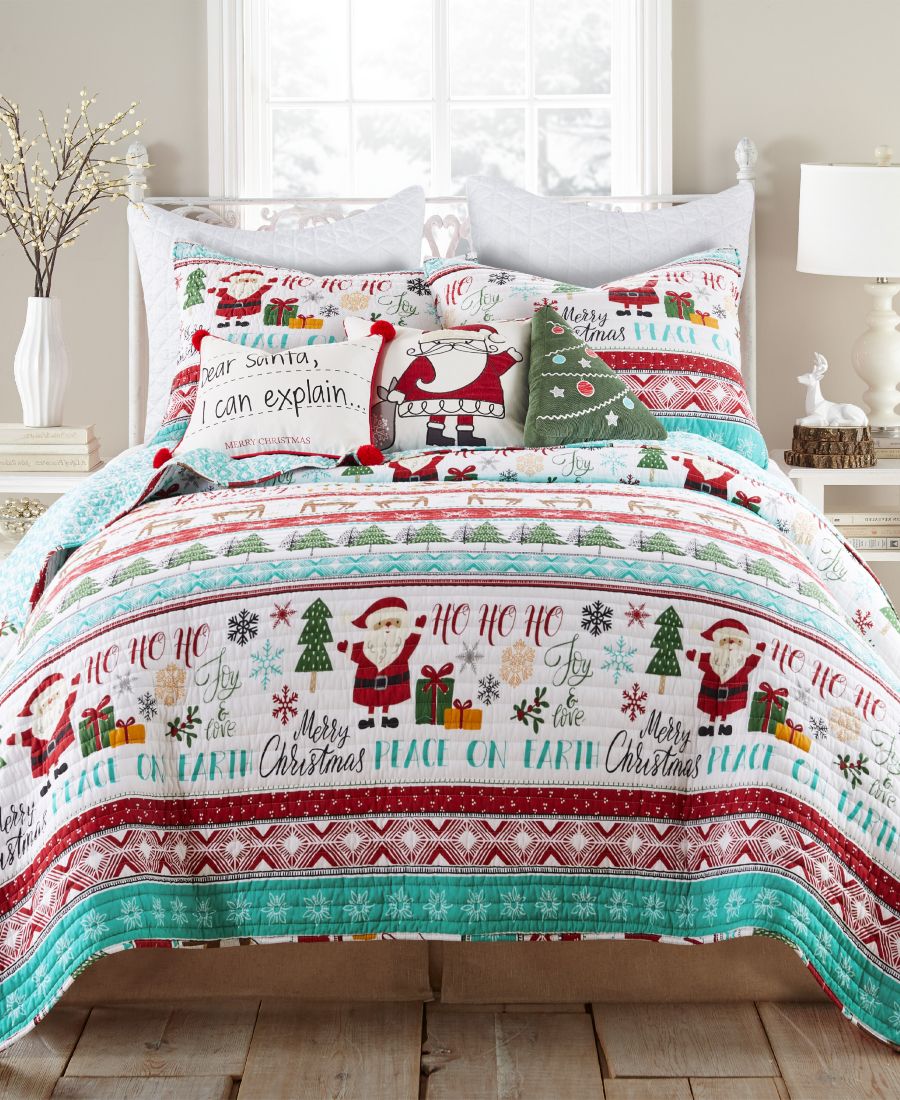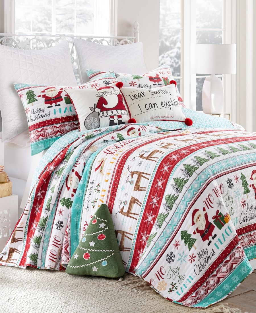 Двустороннее стеганое одеяло Merry Bright Ho Ho Holidays от Levtex Home, вдохновленное радостью и весельем праздничного сезона. Одеяло украшено рядами забавных праздничных узоров, а с другой стороны имеет геометрический узор с окантовкой. Изготовлено из мягчайшей микрофибры, обеспечивающей невероятно приятную на ощупь текстуру.