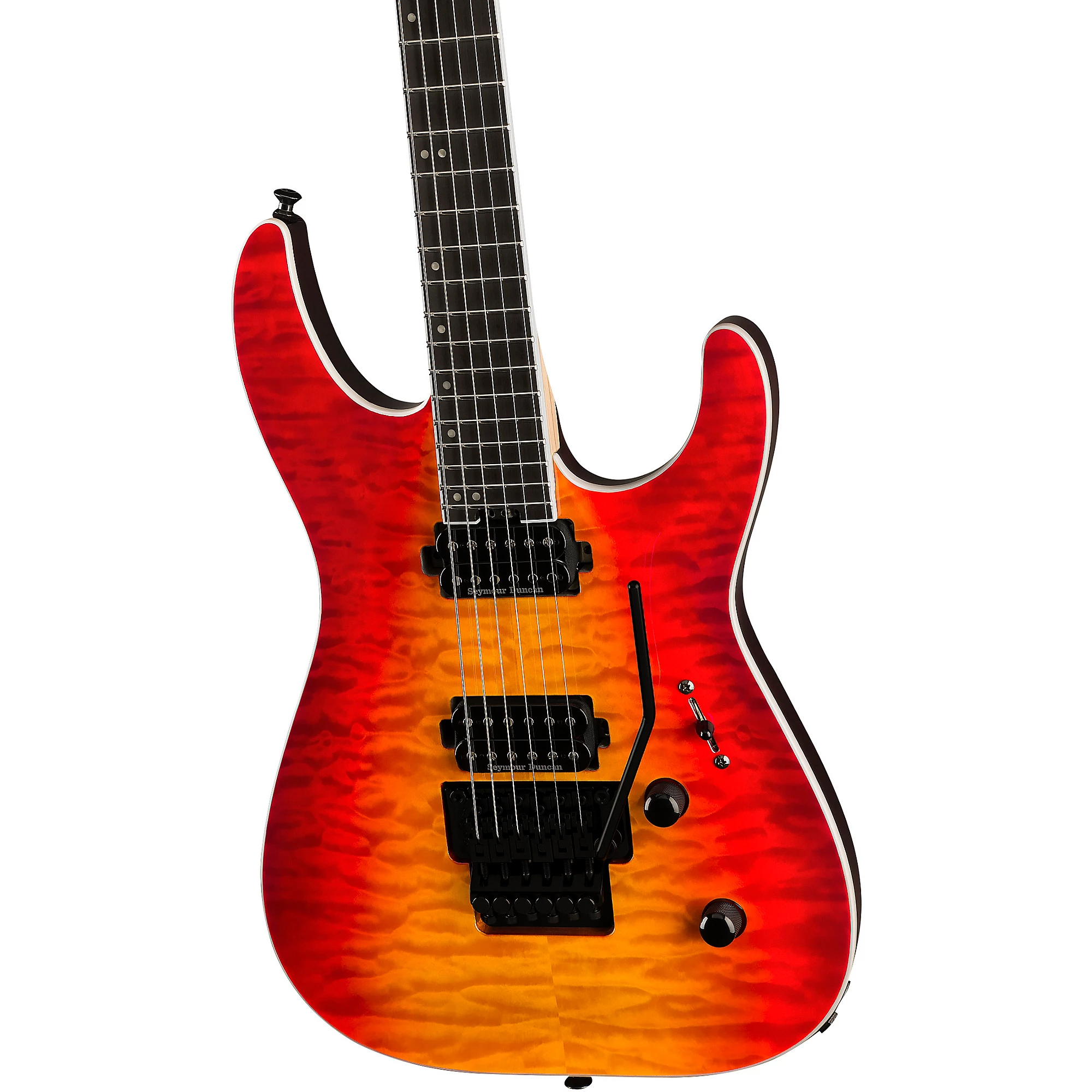 Гитара для экстремального шреда с арочной декой из окуюме и прямым креплением звукоснимателей Seymour Duncan.