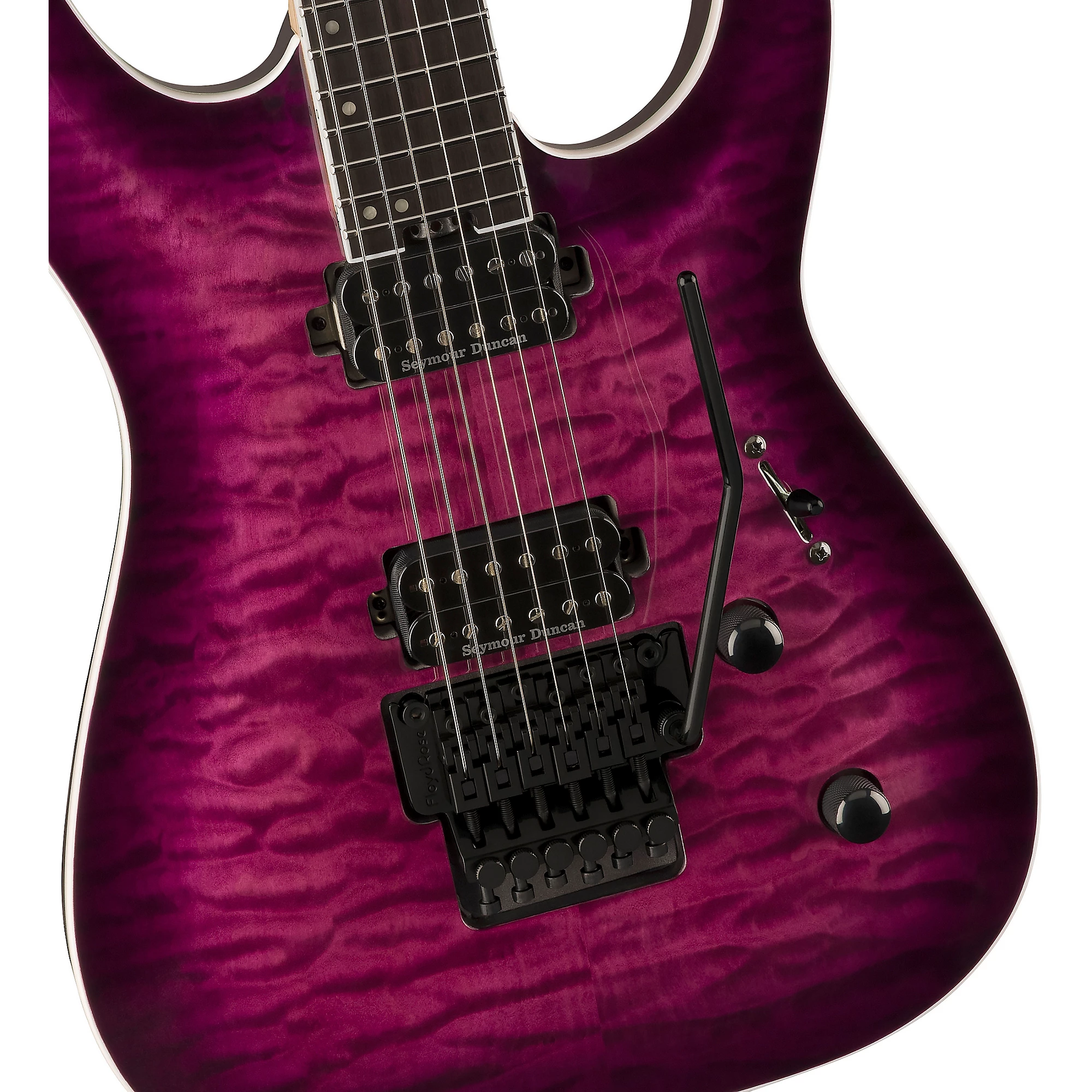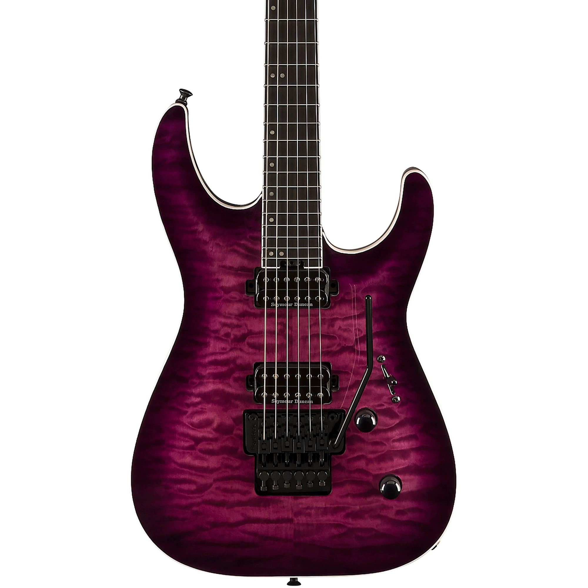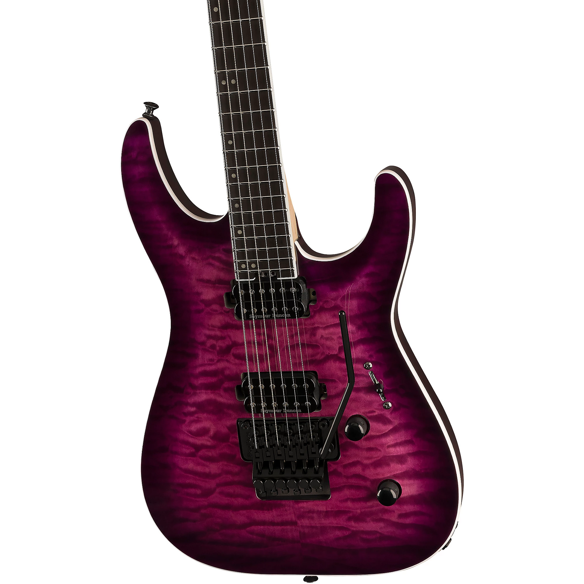 Гитара для экстремального шреда с арочной декой из окуюме и прямым креплением звукоснимателей Seymour Duncan.