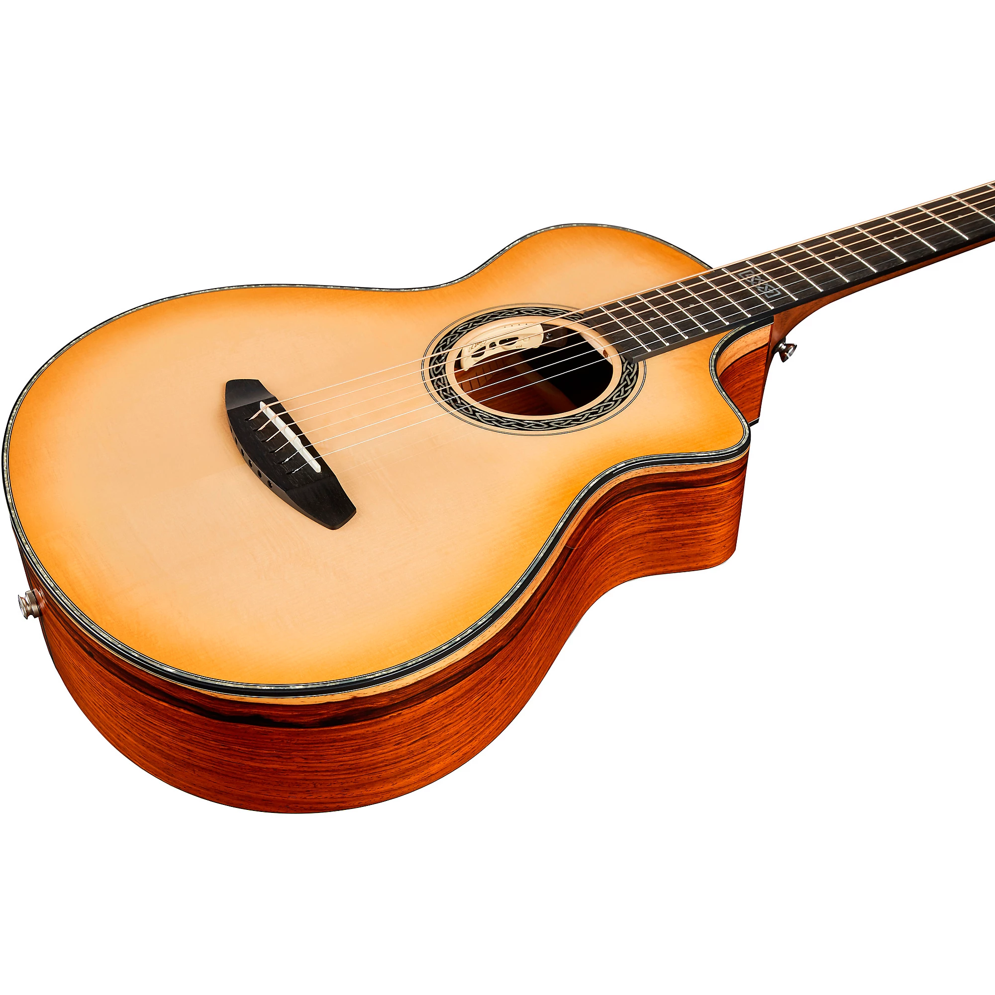 Акустико-электрическая гитара с экзотической древесиной кокоболо для корпуса и верхней дека из ели Адирондака.