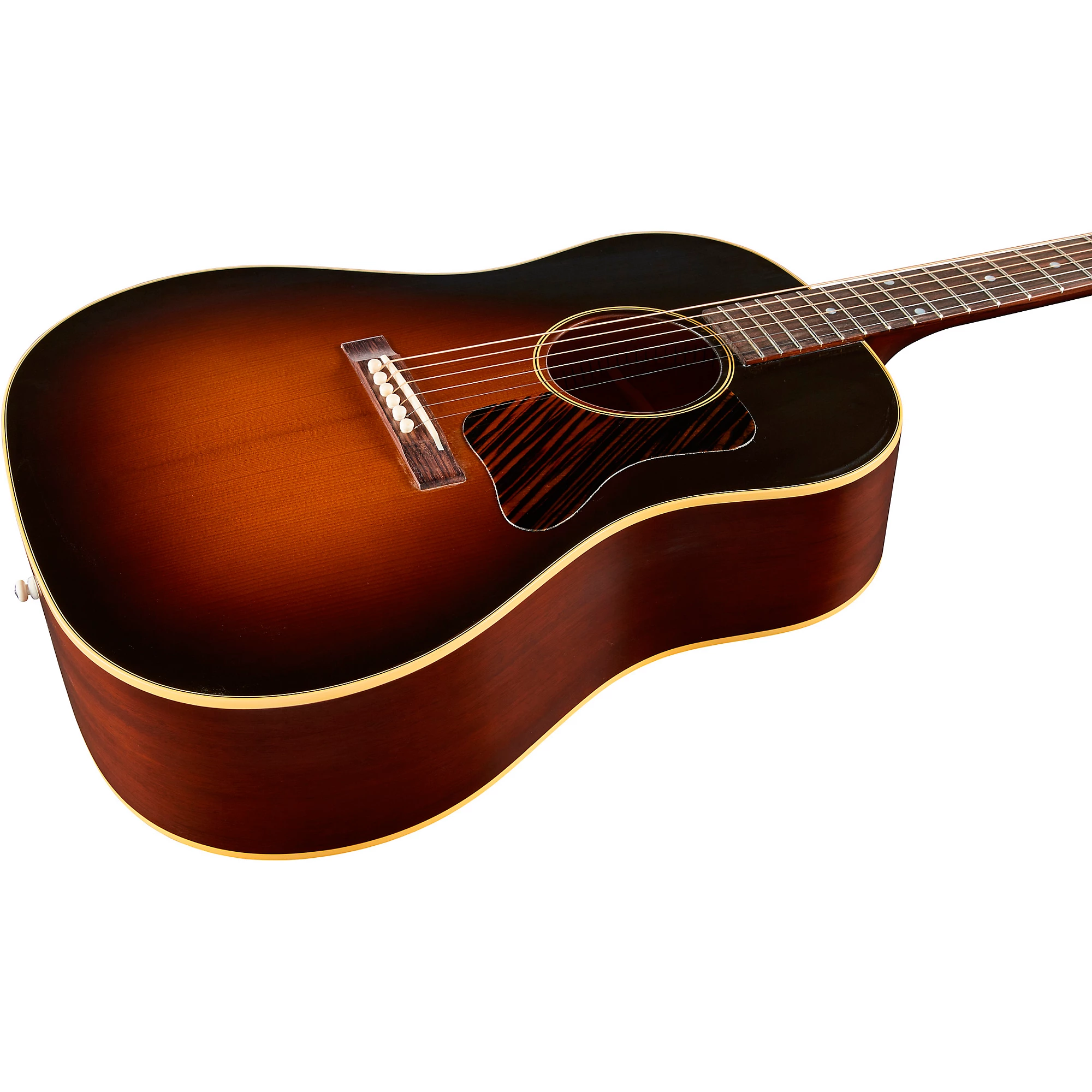 Акустическая гитара, которая передает внешний вид, ощущение и звук знаковой модели Gibson J-35. Gibson J-35 эволюционировала из модели Jumbo в 1936 году, когда Великая депрессия все еще наносила серьезный ущерб американцам. Gibson разработала J-35 как упрощенную модель, но при этом предоставляющую музыкантам теплый и сбалансированный инструмент. Эта Custom Historic 1936 J-35 передает внешний вид, ощущения и звук легендарной Gibson J-35 как опытного винтажного инструмента. Мастера-лютеры из Бозмана, штат Монтана, создали красивый инструмент в винтажном стиле, который наверняка будет желанным для самых взыскательных исполнителей на флаттопах. Модель 1936 J-35 оснащена верхней декой из термически обработанной красной еловой древесины Adirondack, соединенной горячим животным клеем, толстым грифом шириной 1,77’’ у порожка, бриджем с открытыми пазами, костью седлом и колками кремового цвета для ремня.