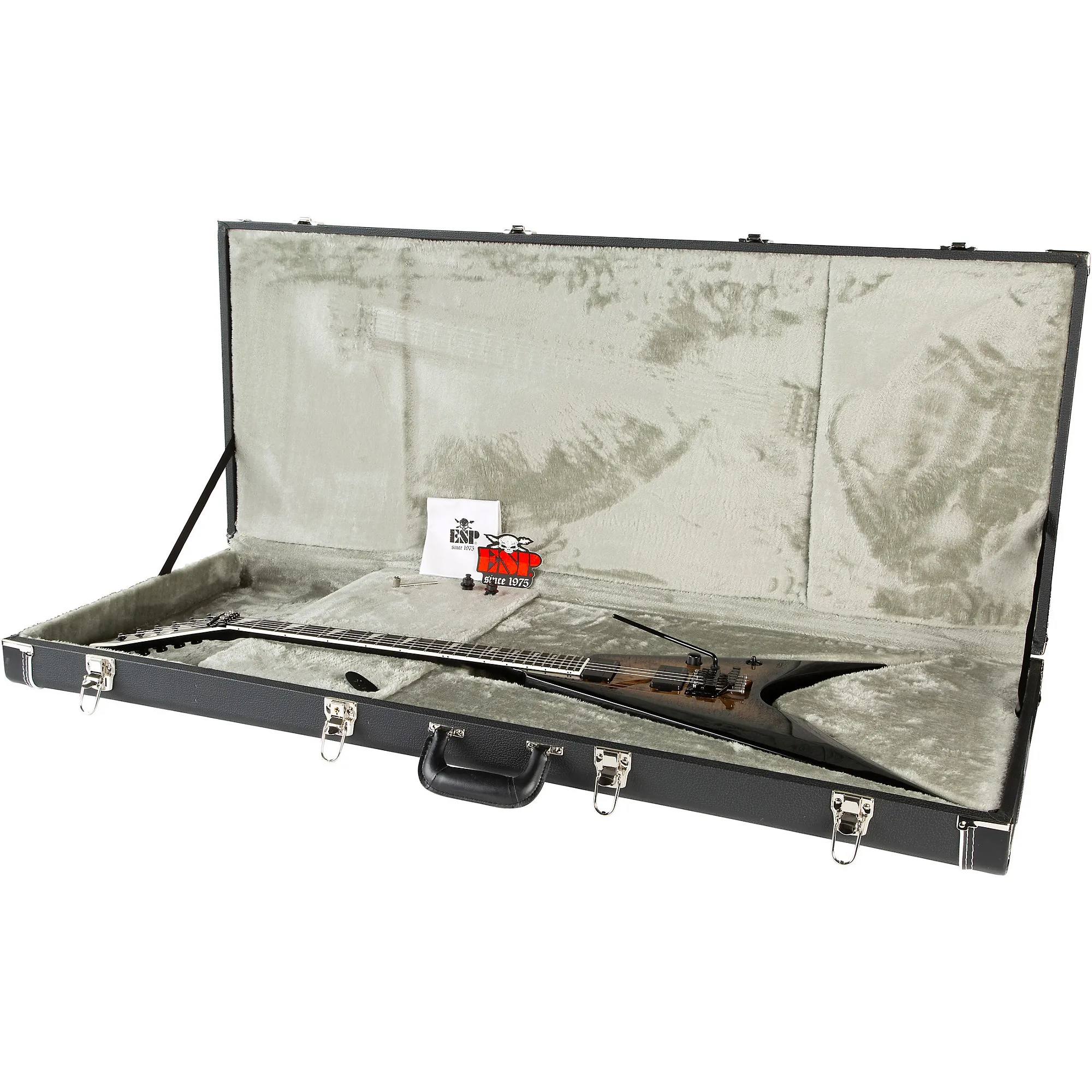 Электрогитара ESP E-II Arrow принимает смелую, скошенную форму модели Arrow и воплощает ее в выдающейся и эффектной отделке с крышкой из клена с сучками, с аналогичной обработкой на головке грифа. Эта гитара с мензурой 25,5 дюймов использует конструкцию «гриф через корпус» для отличного сустейна и стабильности, с 3-частным кленовым грифом и корпусом из ольхи. Ее накладка из эбена оснащена треугольными вставками из перлоида и 24 экстра-джамбо ладами из нержавеющей стали. Задняя часть грифа имеет сатиновую отделку для максимального комфорта при игре. Компоненты ESP E-II Arrow включают тремоло Floyd Rose Original с усовершенствованными винтами из нержавеющей стали, а также блокирующие колки Gotoh и замки ремней ESP. Электрогитара ESP E-II Arrow также оснащена набором прямых хамбакер-пикапов Fishman Modern с черными крышками и функцией push-push для выбора звучания. Элитный жесткий кейс ESP включено.