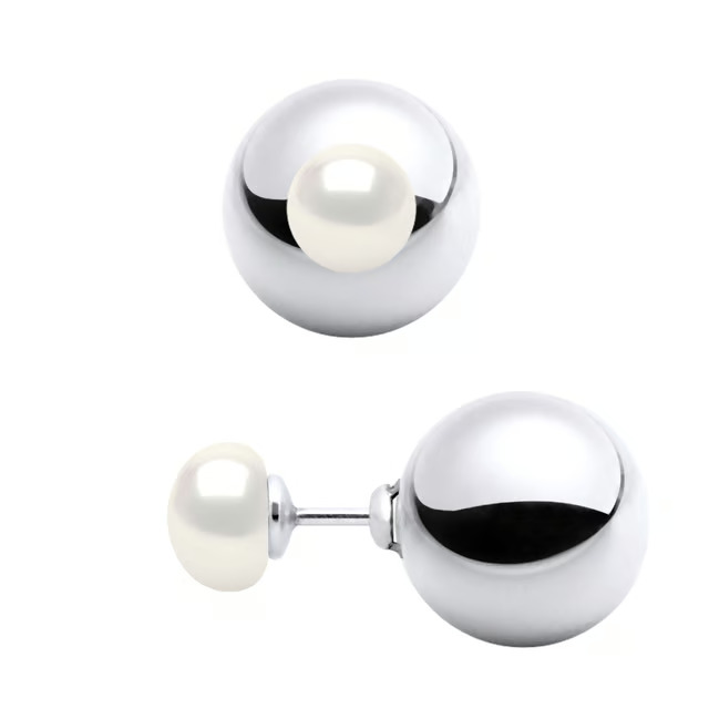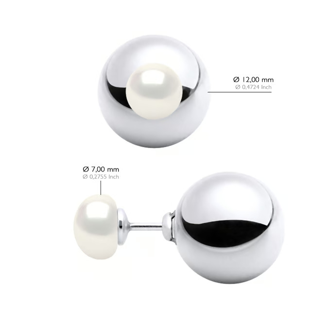 Серьги из натурального жемчуга и серебра с двусторонним дизайном. Каждая серьга украшена двумя культивированными жемчужинами натурального белого цвета диаметром 7 мм. Застёжка в виде шариковой защёлки из родированного серебра 925 пробы.