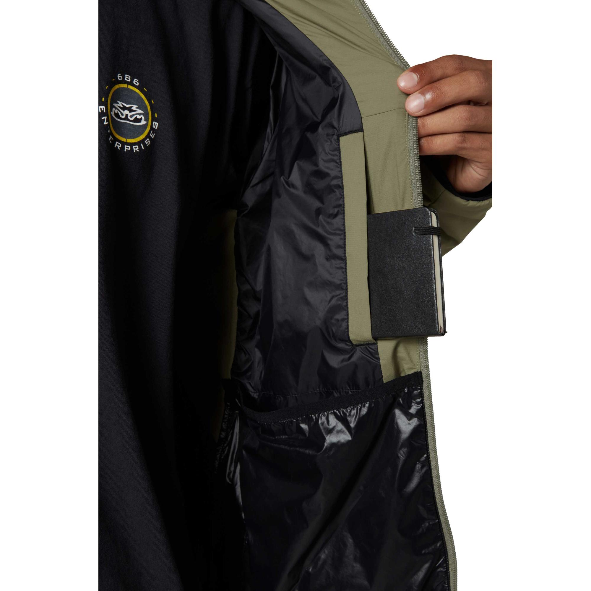 Мужская куртка 686 PRIMALOFT Source идеально сочетает в себе легкость и комфорт, а также исключительную теплоизоляцию, что делает ее идеальным промежуточным слоем для активных дней в горах или прохладных вечеров в городе. Изготовленная из прочной 100% нейлоновой ткани rib-stop с водоотталкивающей пропиткой DWR, эта куртка выдерживает любые погодные условия, обеспечивая при этом превосходную теплоизоляцию благодаря 60 г утеплителя PrimaLoft Black Insulation PURE Cut Staple Fibers. Инновационный дизайн включает в себя вставку из полиэстерового флиса под мышками для максимальной свободы движений, обеспечивая неограниченную свободу как при катании на склонах, так и во время неспешной прогулки. Карманы на молнии для рук надежно хранят ценные вещи, а компактная конструкция позволяет легко сложить куртку в собственный карман на молнии. Капюшон из трех панелей обеспечивает дополнительную защиту от ветра, а регулируемый низ позволяет настроить посадку под себя, обеспечивая комфорт независимо от вида активности. Три внутренних и два внешних кармана обеспечивают достаточно места для хранения необходимых вещей. Эта куртка идеально подходит для любителей активного отдыха на природе, которые ценят универсальность и стиль, а также тепло и комфорт в одном элегантном слое одежды.