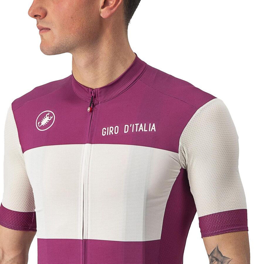 Веломайка Castelli Fuori #GIRO - это легкая веломайка с короткими рукавами, идеально подходящая для любых летних поездок по шоссе. Три задних кармана вмещают перекус, инструменты, телефон и другие необходимые вещи, а задние захваты обеспечивают надежную фиксацию майки при резком старте.
