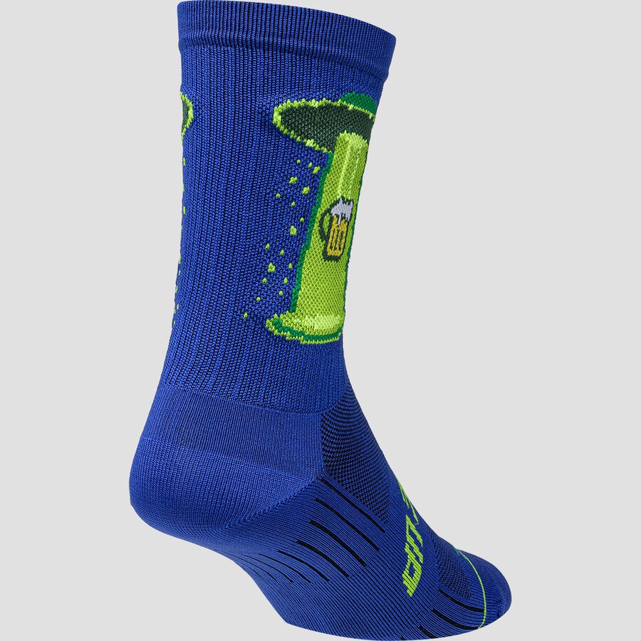 Я - эклектичный носок королевского синего цвета, сделанный из самого тонкого и прочного влагоотводящего материала во Вселенной. Моя манжета подсвечена неземным зеленым свечением, изображающим мой НЛО, посылающий еще один из лучших крафтовых сортов пива Земли.