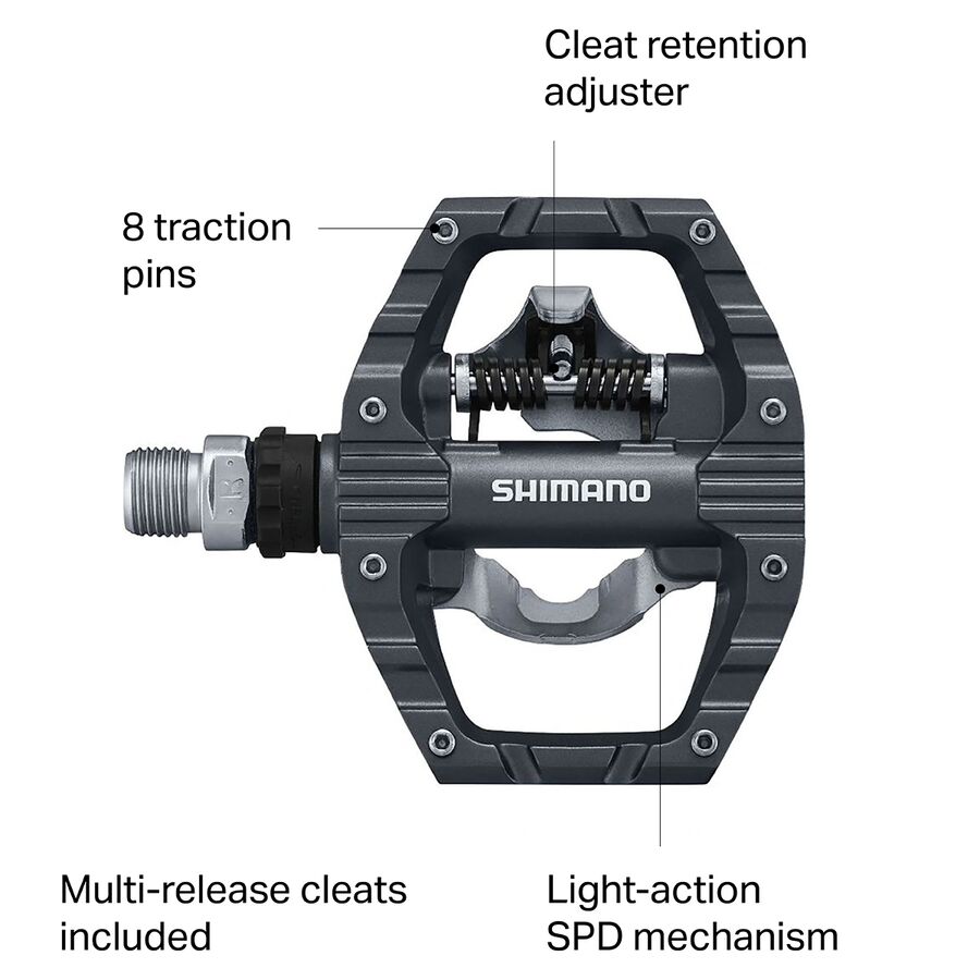 Педали Shimano PD-EH500 - это двусторонние педали, имеющие с одной стороны механизм SPD-клипсы, а с другой - платформу с шипами для сцепления. Это дает вам свободу ездить как с контактными педалями, так и без них, без необходимости постоянно менять педали. Они хорошо подходят для городской езды, велопутешествий или легкой езды по бездорожью, и отличаются легким ходом, что значительно облегчает частое вставание и вынимание педалей. Кроме того, в комплект входят многофункциональные шипы SH56, которые еще больше упрощают отстегивание, позволяя вам перемещать пятку в нескольких направлениях для отстегивания, а не только отталкиваясь пяткой горизонтально.