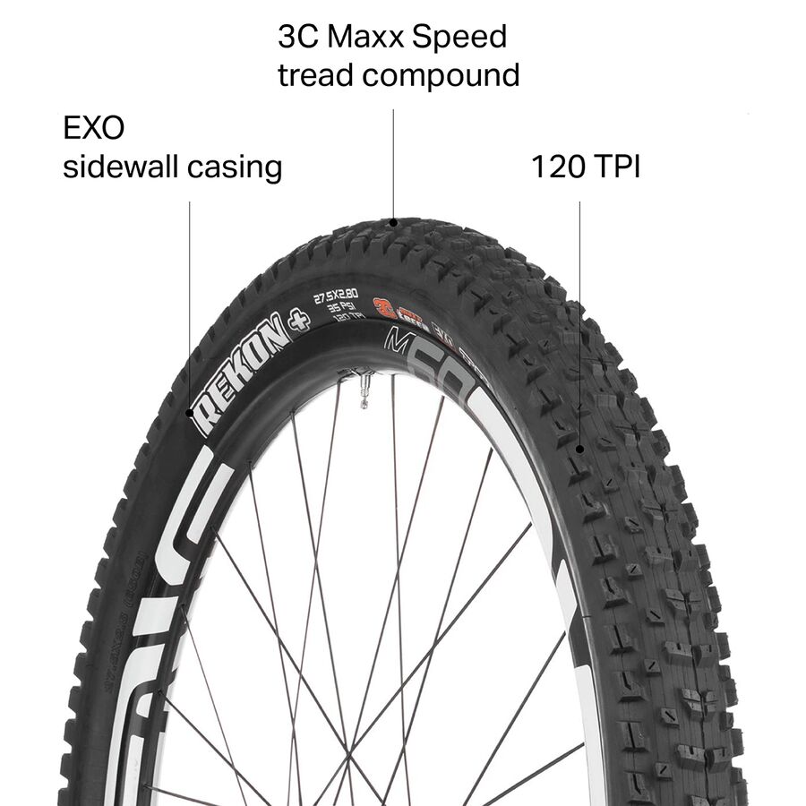 Шина Maxxis Rekon 3C/EXO/TR 27.5+ может похвастаться массивными, широко расположенными шипами, созданными для преодоления любых условий трассы. Благодаря ламелированным краям шипов и скошенным центральным шипам, Rekon сочетает в себе высокое сцепление с высокой скоростью качения, и все это в мягком, увеличенном размере, позволяющем плавно преодолевать любые препятствия, от твердого грунта до рыхлой и пыльной поверхности.