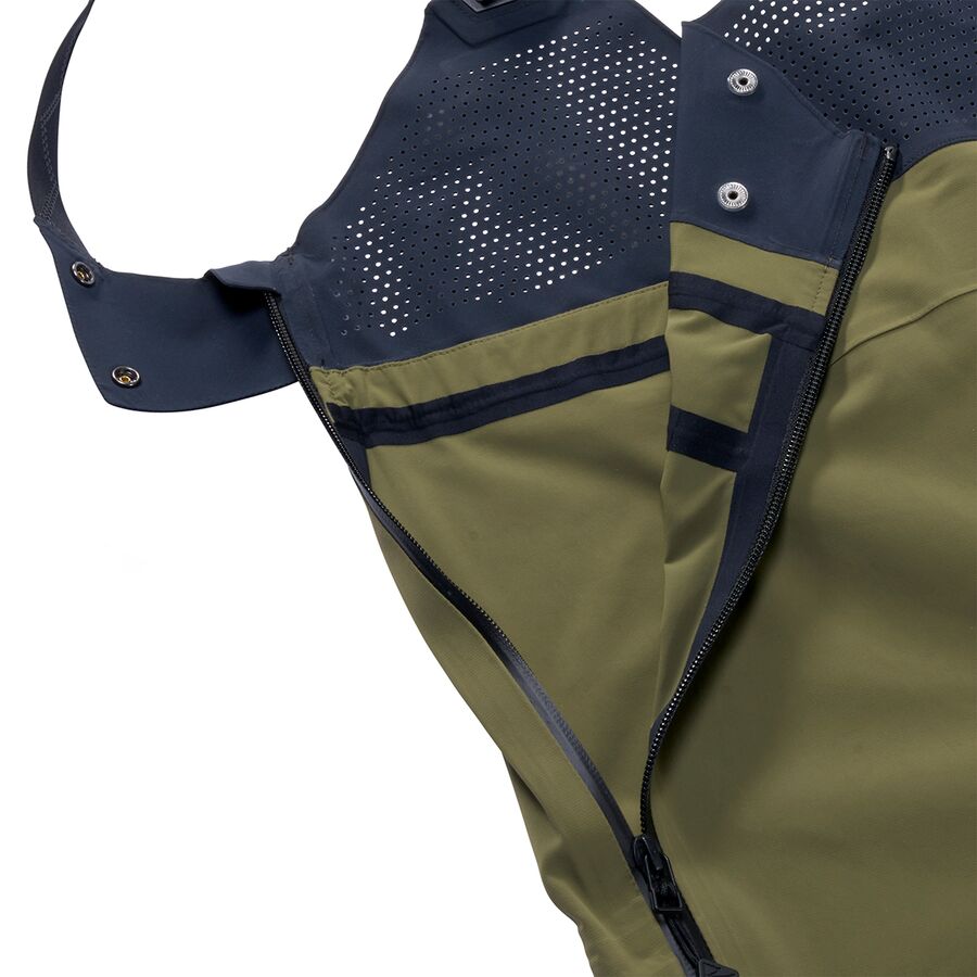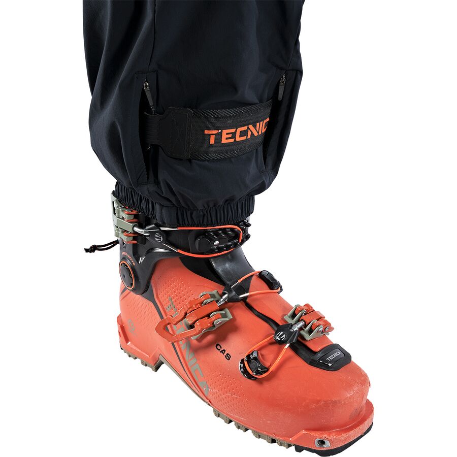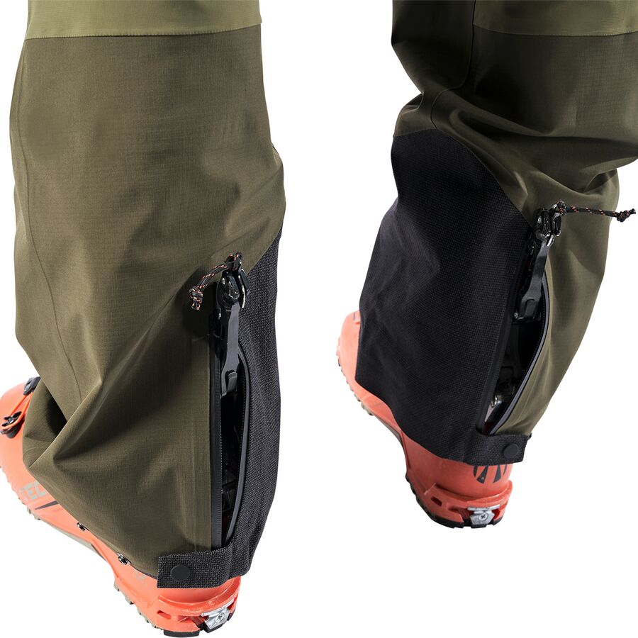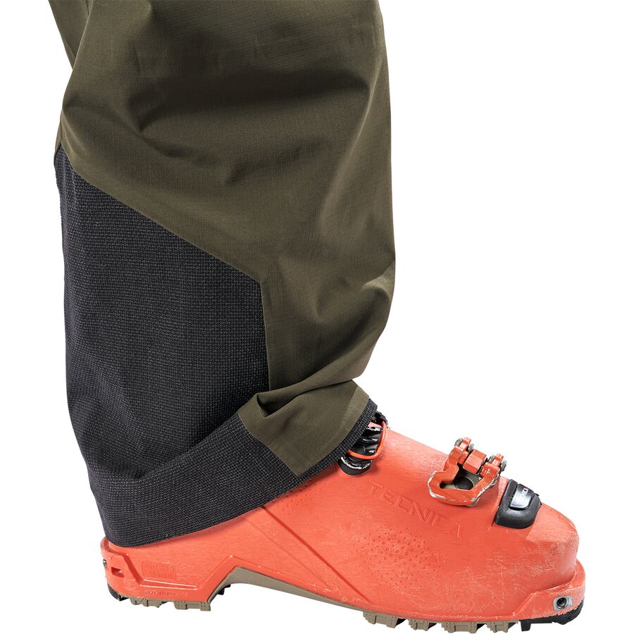 Продуманный дизайн продолжается функциональными деталями, адаптированными для ски-тура. Двойные карманы для лавинного маяка с точками крепления надежно фиксируют лавинное снаряжение, а вентиляционные отверстия на бедрах отводят тепло при больших подъемах. Сверхдышащая панель комбинезона с лазерной резкой и поясничной вентиляцией делает подъем более комфортным, а откидная задняя часть добавляет удобства без ущерба для защиты. Внизу - интегрированные гетры с дополнительным ремешком. Сквозные отверстия предотвращают попадание снега, а усиленный кевларом нижний край защищает от ударов кантами лыж, кошек и неровной местности.