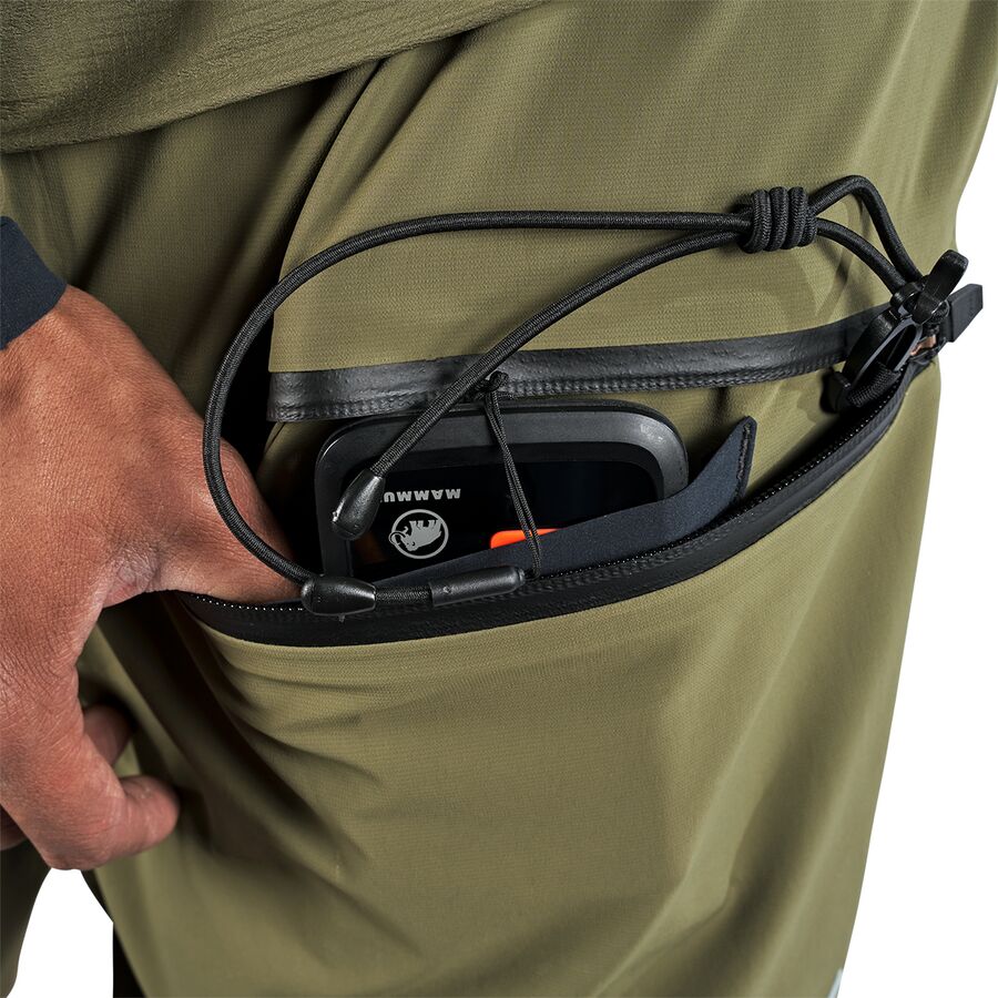 Материал: [ламинат] водонепроницаемый 30K / дышащий 20K 3L, [лицевая ткань] 100% нейлон рипстоп хардшелл (70dx70d) с водоотталкивающей пропиткой без ПФУ, [софтшелл] нейлон Toray Primeflex с двухсторонней эластичностью и водоотталкивающей пропиткой без ПФУ, [нашивка на бока] Schoeller Keprotech