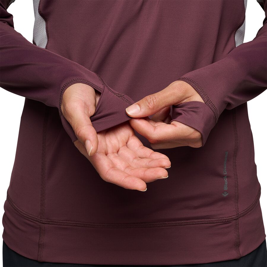 "Эта толстовка - мой незаменимый помощник для восхождений в солнечную погоду и при переменчивой горной погоде. Ткань с защитой UPF 50+ защищает от палящих лучей, а водоотталкивающая пропитка без ПФУ отталкивает легкую влагу, когда набегают облака. Кроме того, сетчатые вставки под мышками и молния на четверть длины делают ее очень дышащей, когда я интенсивно работаю."