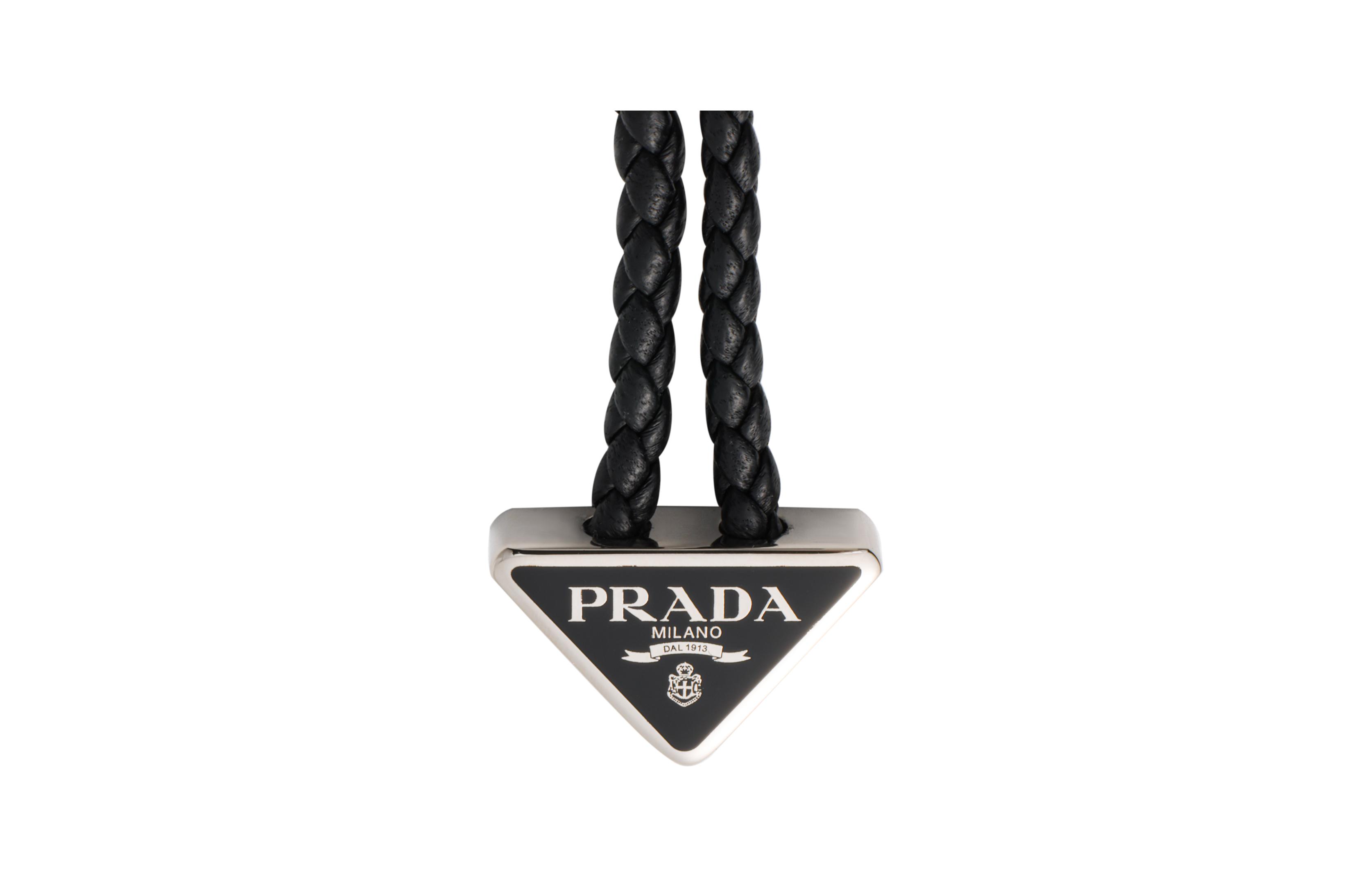 Этот плетеный кожаный браслет имеет оригинальную застежку с треугольным логотипом. Его можно носить как отдельно, так и в сочетании с другими браслетами.