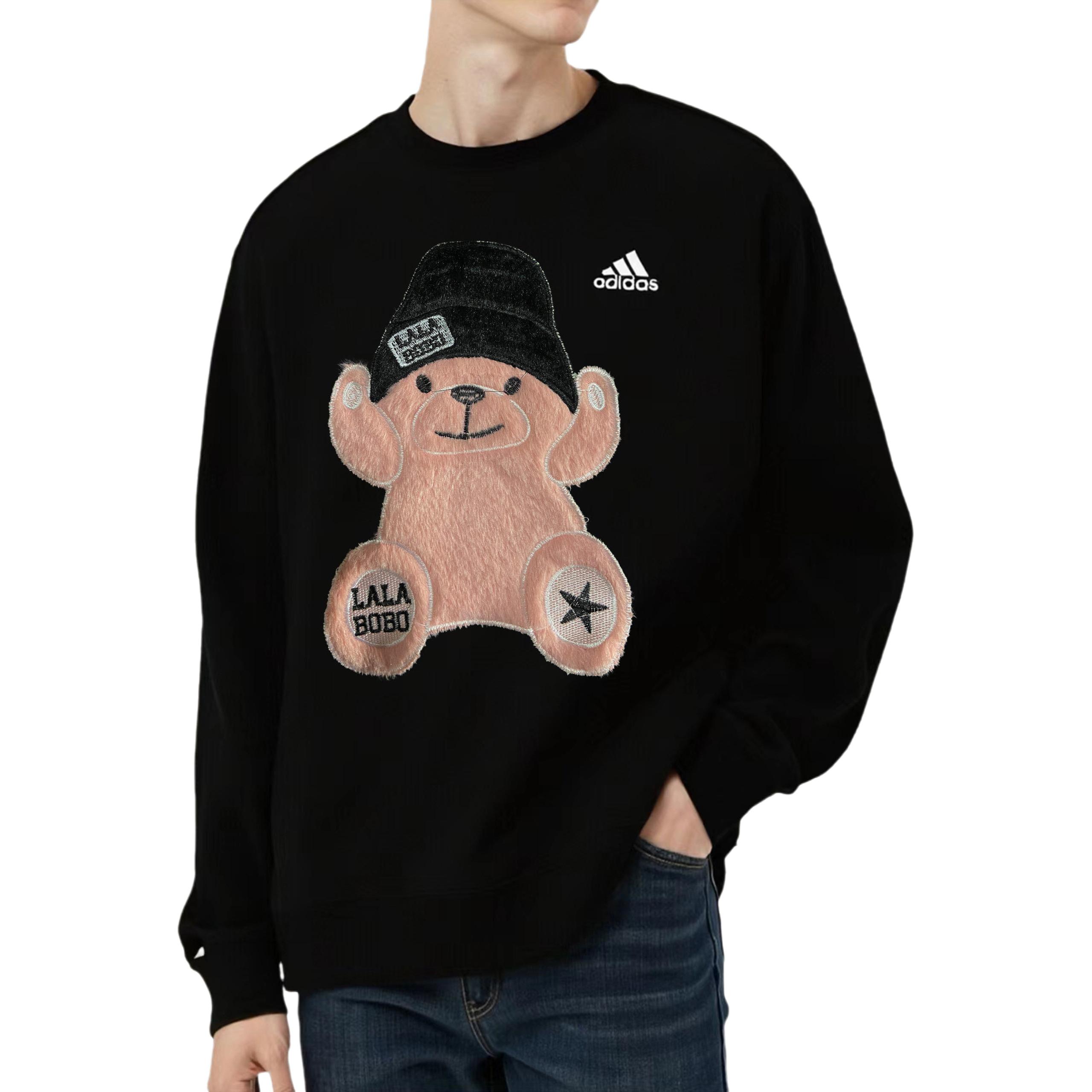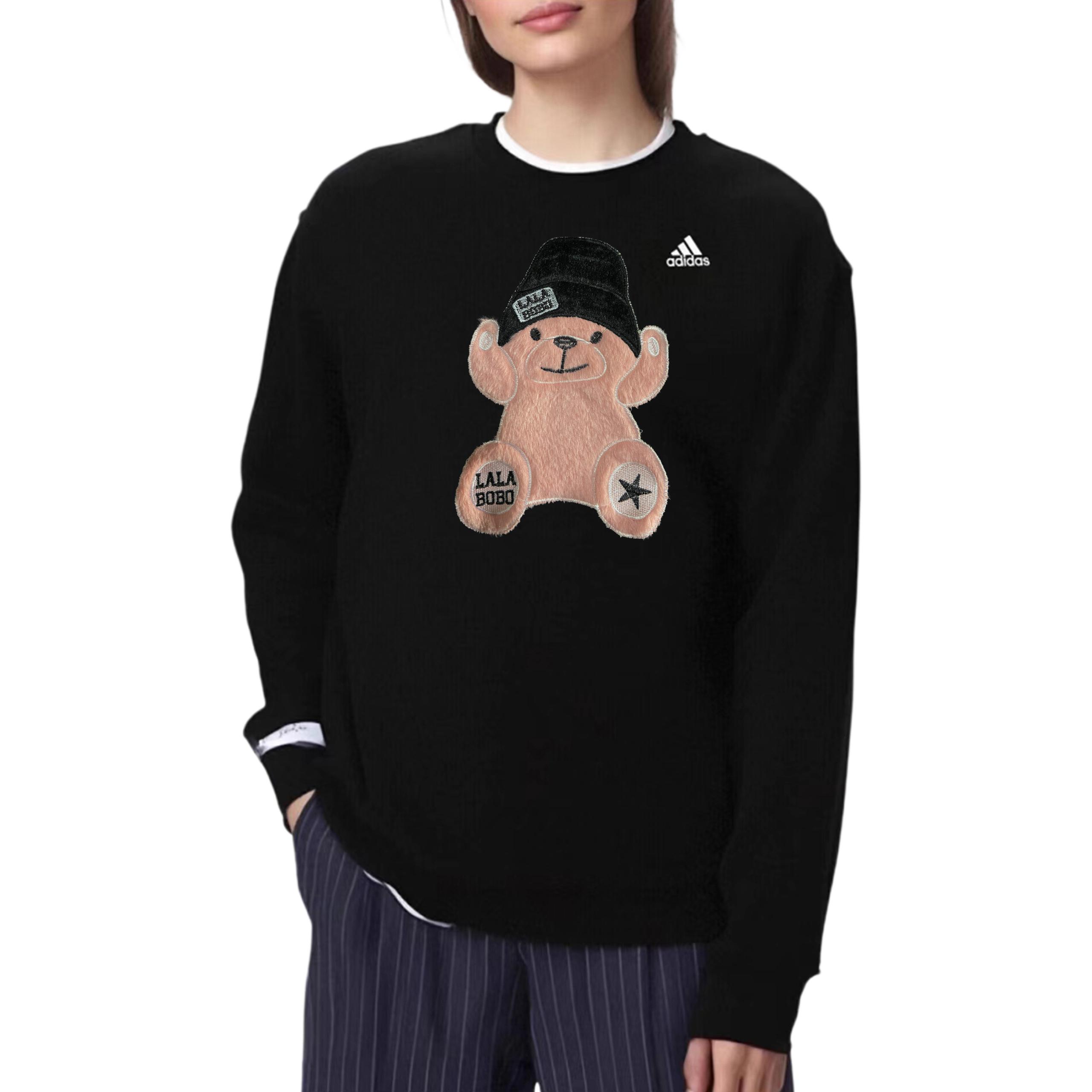 Эта персонализированная одежда выполнена в оригинальном стиле adidas LABEL. Вдохновение для дизайна черпалось из контрастных стилей и модных милых элементов. Мягкий и симпатичный розовый плюшевый мишка сочетается со стильной черной бейсболкой и аппликациями в виде звезд. Контраст между «милым» (розовый мишка) и «крутым» (модные аксессуары) соответствует теме «Розовый крутой мишка» и отражает популярную сегодня эстетику «милый и крутой». Простой дизайн подчеркивает изысканную вышивку на плюшевом мишке, сохраняя повседневные черты бренда уличной одежды, но усиливая модный стиль благодаря деталям «шляпа + аппликация». Логотип «LALA BOBO» и звездные украшения на лапах мишки делают милые элементы более персонализированными, а контрастные цвета черного фона и розового мишки делают узор более привлекательным, что делает его запоминающимся для повседневной носки.