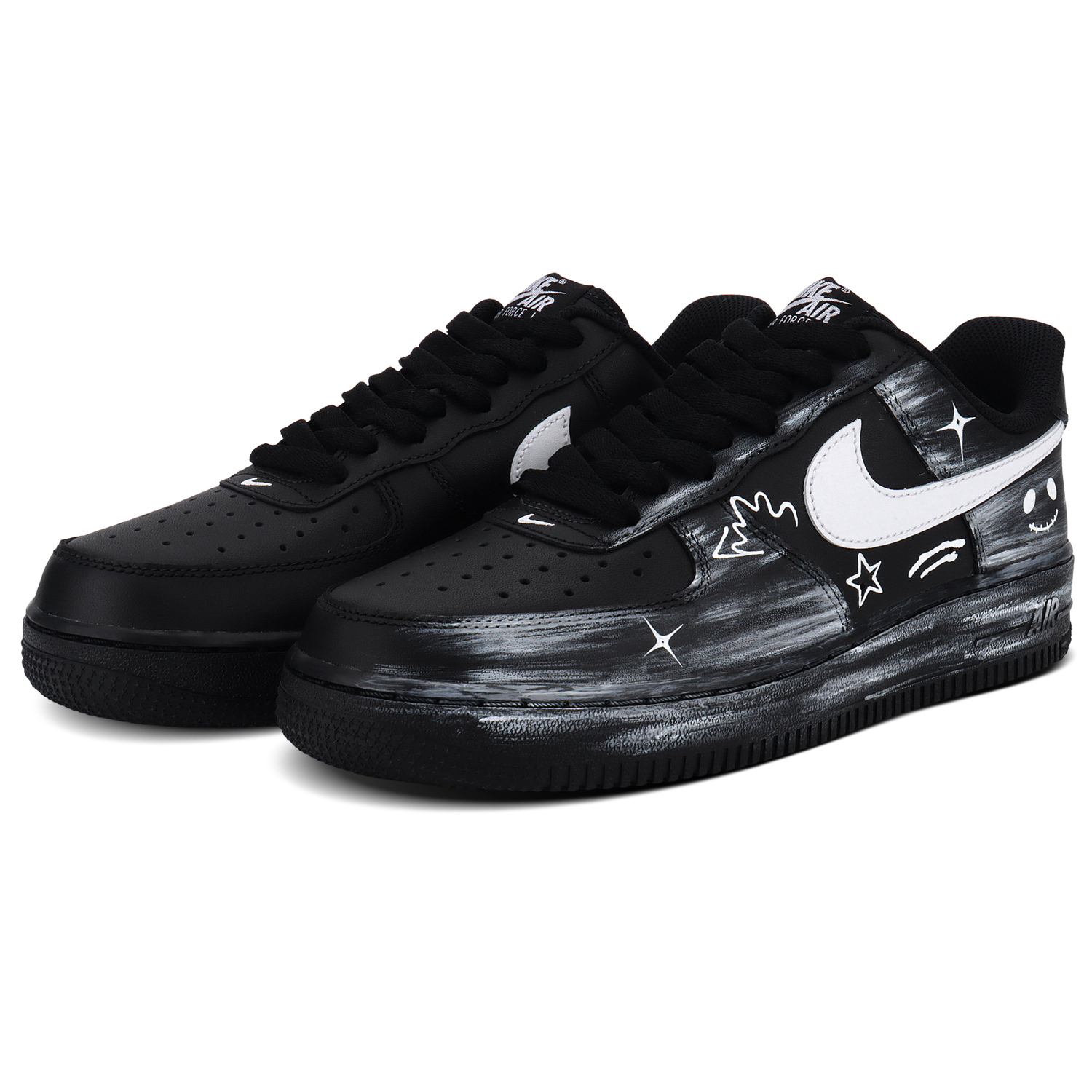Это кастомные кроссовки, расписанные вручную, созданные на основе классической модели Nike Air Force 1 Low. Они сохраняют культовый кожаный верх и амортизирующую подошву Air для комфорта, а граффити, нанесенное вручную, придает им свежий новый вид. Общая цветовая гамма - черный и серый, дополненные белым логотипом Swoosh с текстурой брызг, а также элементами ручной росписи, такими как звезды, игривые смайлики и линии, создающие визуальный эффект «галактического граффити», сочетающий в себе крутость уличного стиля и игривость. Эти кастомные кроссовки расписаны профессиональной краской для кожи и обычно обработаны для защиты от царапин и воды. Они сохраняют практичность AF1, позволяя при этом выразить свою индивидуальность благодаря уникальному дизайну, выполненному вручную. Подходят для повседневной носки, чтобы не носить одну и ту же обувь с другими, а также станут очень персонализированным подарком, что делает их популярным выбором среди любителей нишевых кроссовок.