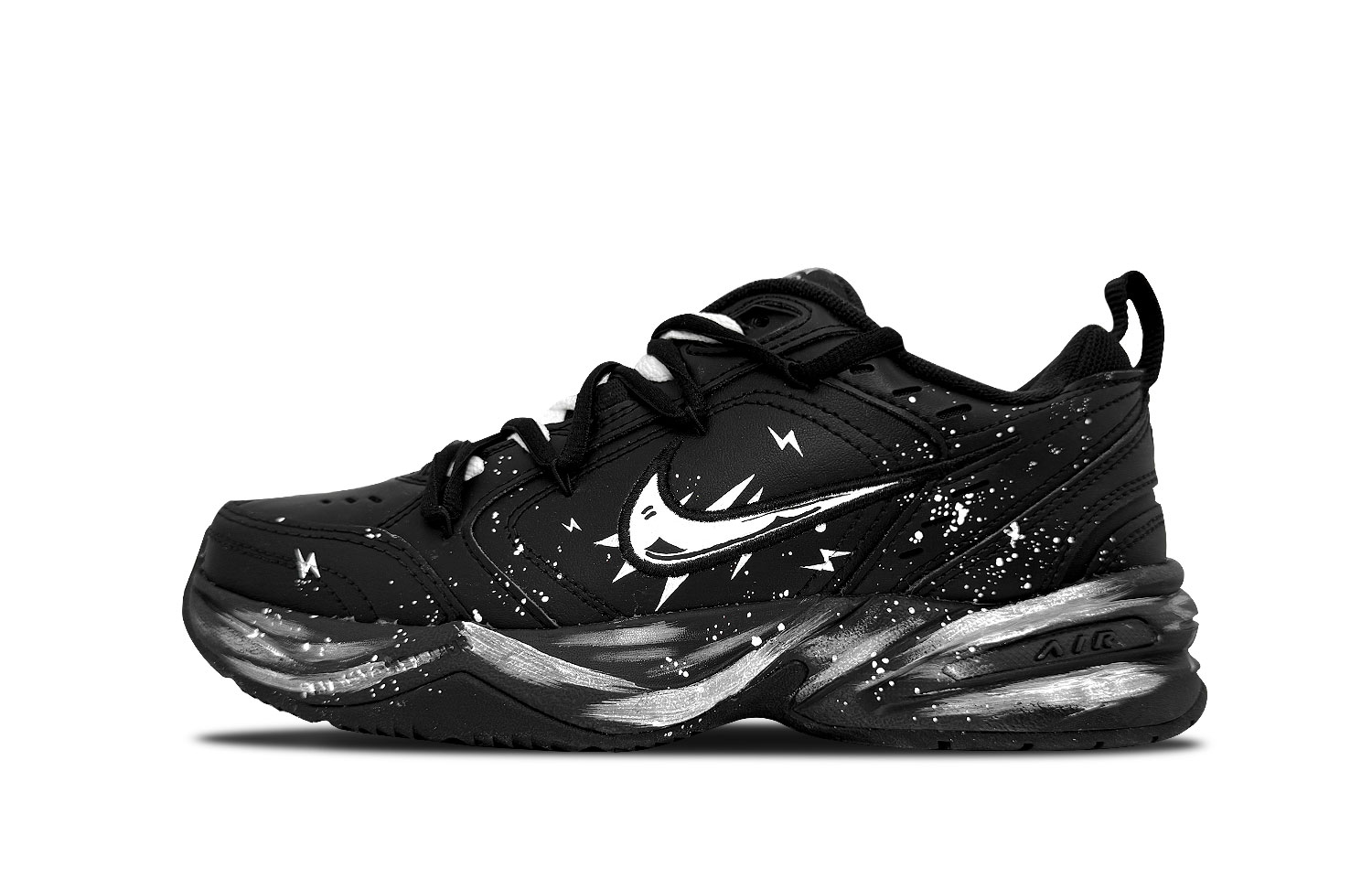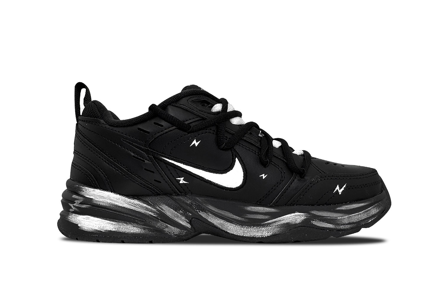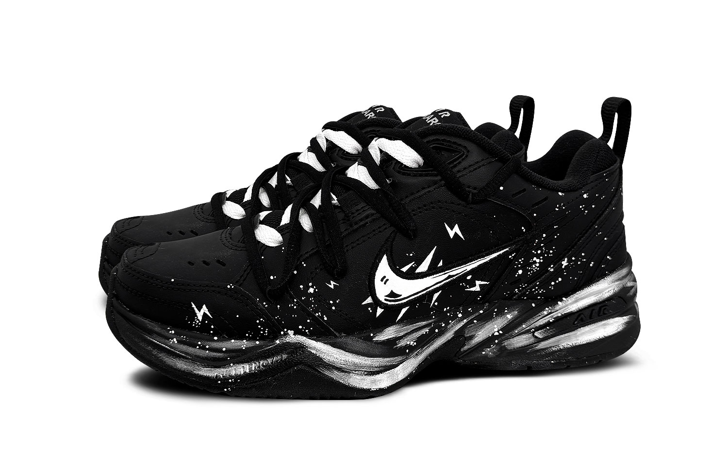 Эти кастомные кроссовки созданы на основе оригинальной модели Nike Air Monarch 4 retro casual low-top dad shoes черного цвета, унисекс, с оригинальным артикулом 415445-001. Вдохновением для дизайна послужила белая буря.