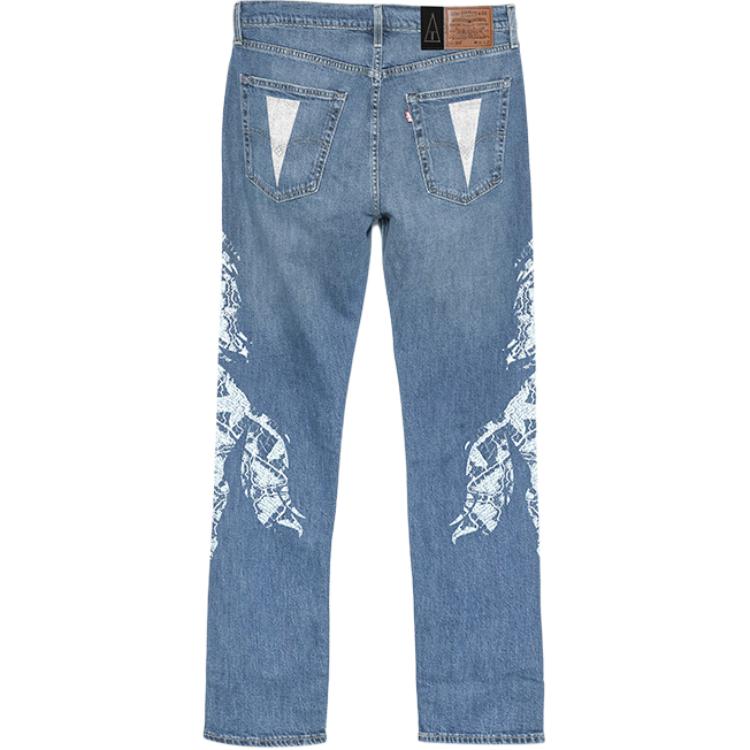 Эта сшитая на заказ модель выполнена из оригинальных джинсов Levi's 505 прямого кроя со средней посадкой, синего цвета, унисекс. Вдохновением послужила плоская однотонная ткань.