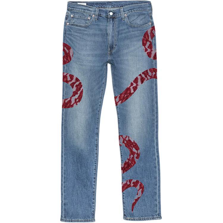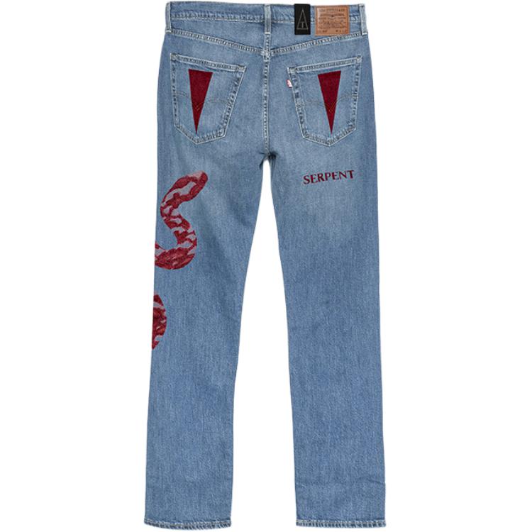 Эта сшитая на заказ модель выполнена из оригинальных джинсов Levi's 505 прямого кроя со средней посадкой, синего цвета, унисекс. Вдохновением послужила змея.