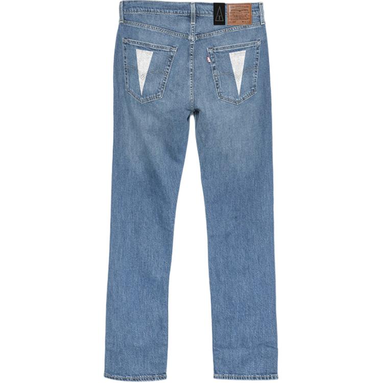 Эта сшитая на заказ модель выполнена из оригинальных джинсов Levi's 505 прямого кроя со средней посадкой, синего цвета, унисекс. Вдохновением послужил образ черепа.