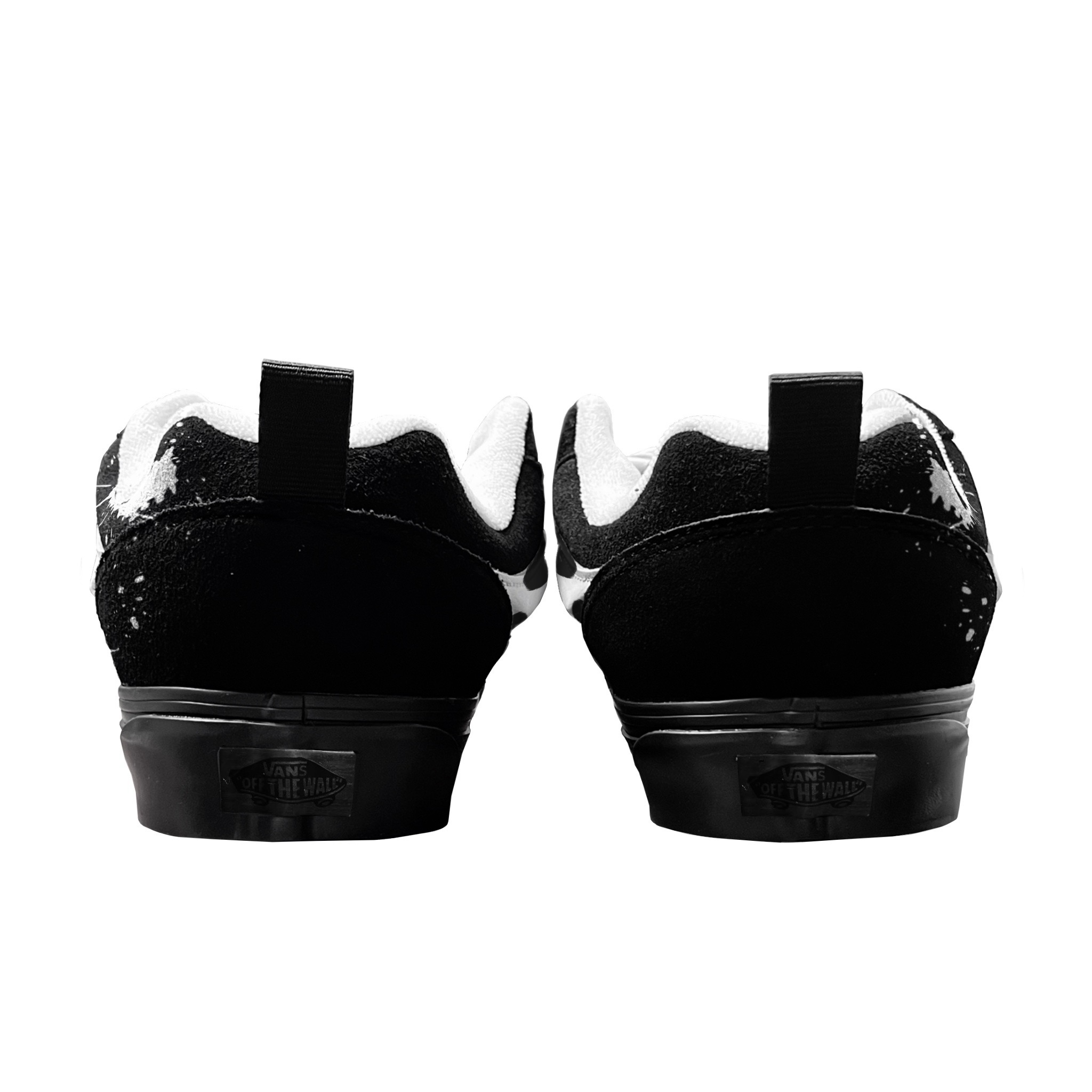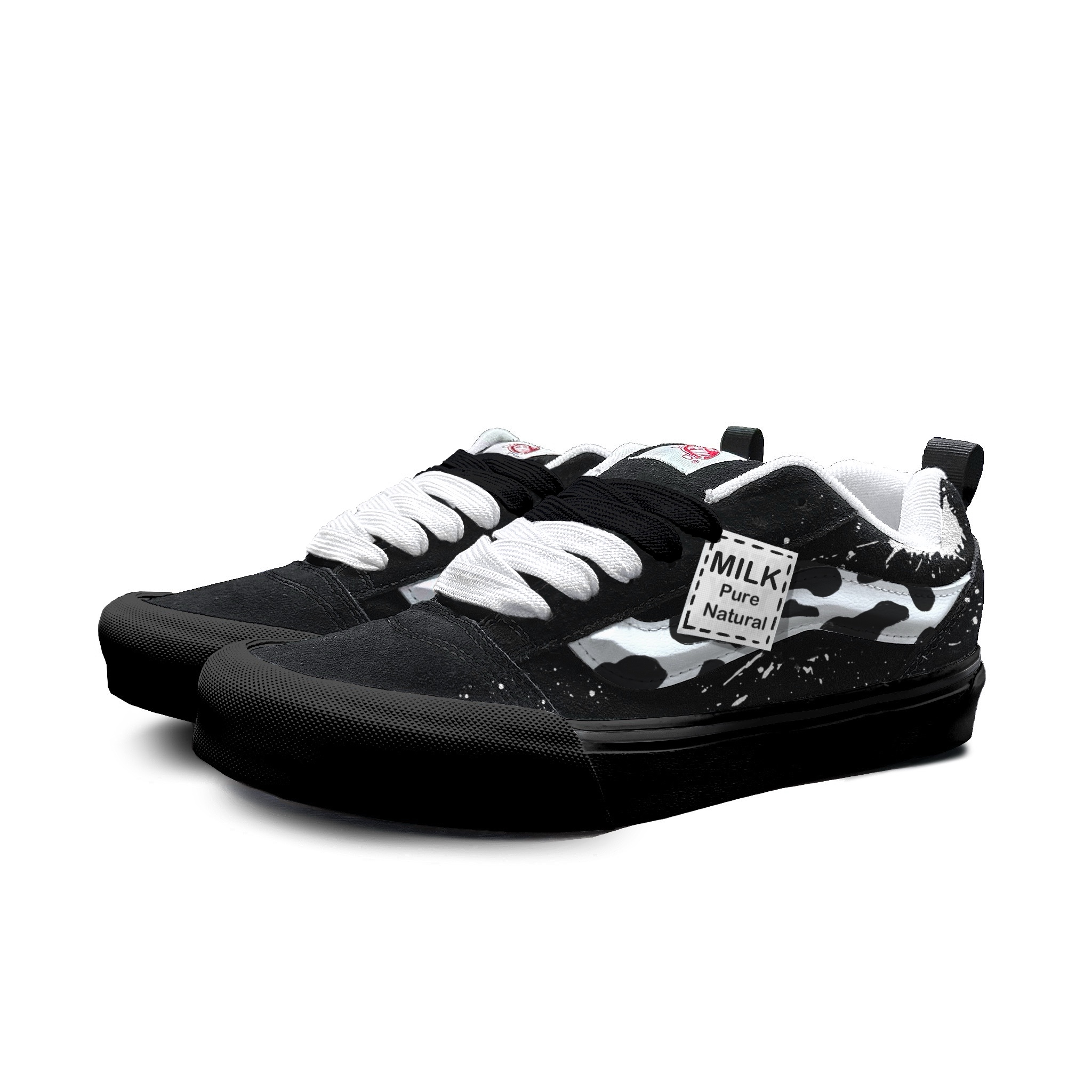 Эти кроссовки, созданные на заказ, основаны на оригинальных американских ретро-лоферах Vans Knu Skool с плетеной конструкцией - модных, повседневных, прочных низких кроссовках для мужчин и женщин с черно-белой подкладкой (артикул VN0009QC6BT1). Дизайн выполнен в черно-белой цветовой гамме, сочетающей элементы граффити и минималистичный подход. Черно-белые узоры в виде коровьих пятен искусно сочетаются с белыми брызгами краски, добавляя элементы молочной тематики для создания игривого, но модного визуального образа, демонстрирующего уникальную индивидуальность.