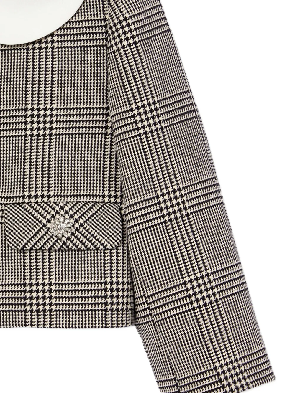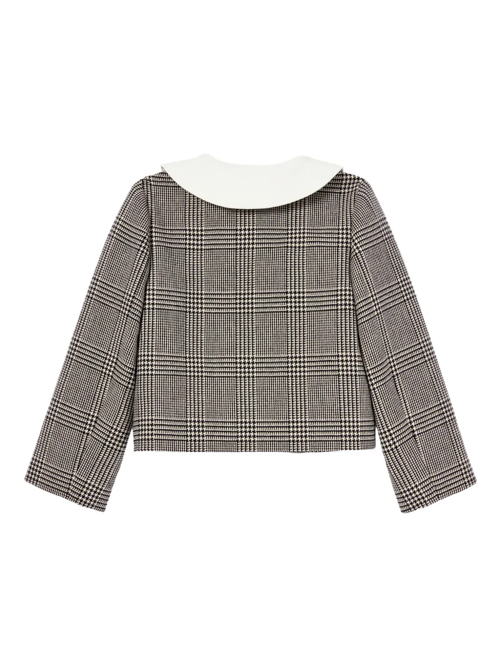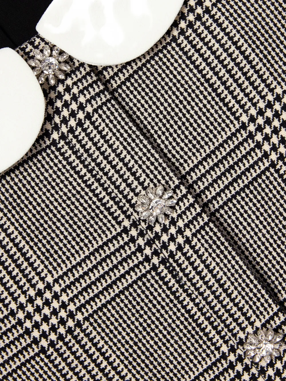 Отделка в черно-белую клетку, воротник Питер Пэн, накладные карманы спереди, застежка на пуговицы