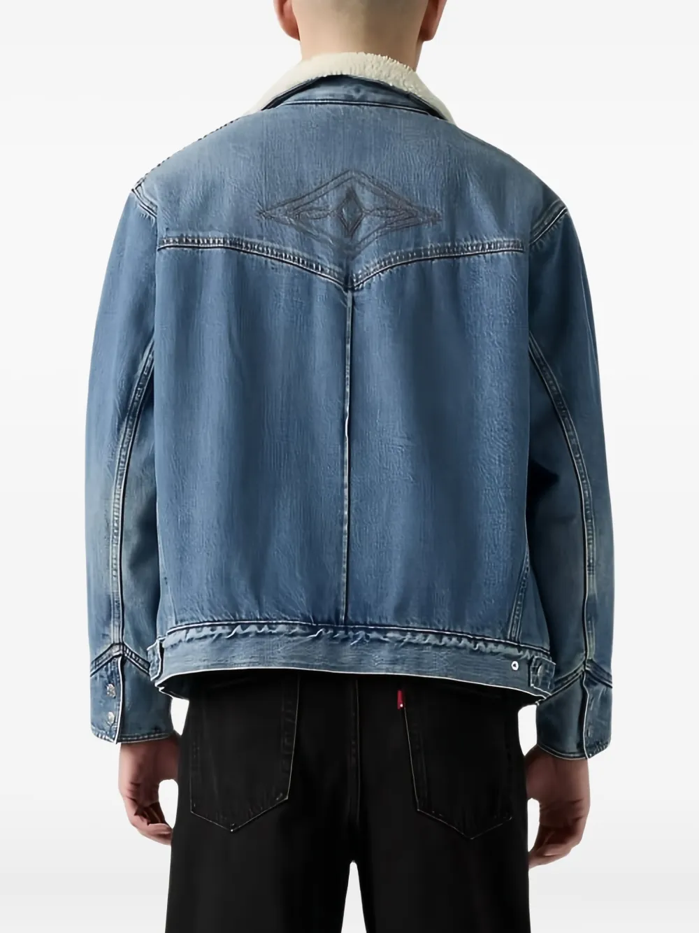 Средне-синий цвет, шерпа-воротник, застежка на пуговицах, вышивка на груди, прорезные карманы, манжеты на пуговицах
