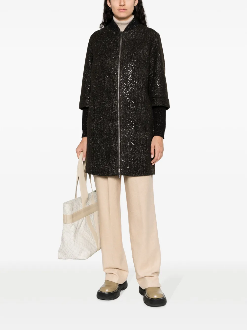 Серо-коричневый, смесовая шерсть мериноса, люрекс, украшение из пайеток, воротник-стойка в рубчик, длинные рукава, рукава с узкими манжетами, застежка на молнии спереди, два вшитых кармана по бокам, прямой подол и длина до бедер.