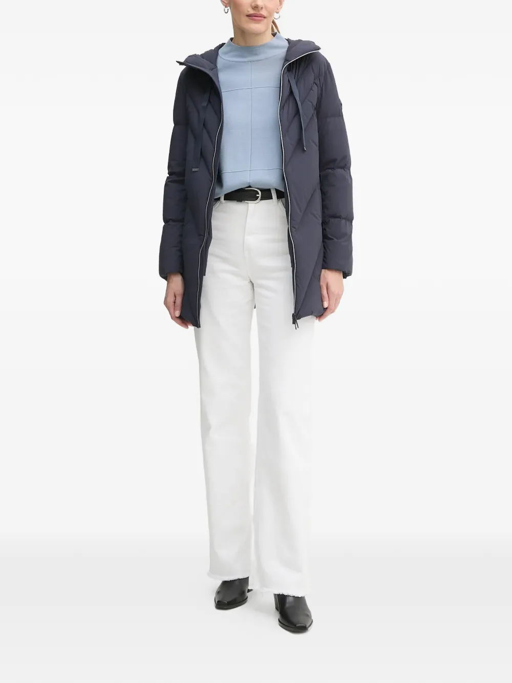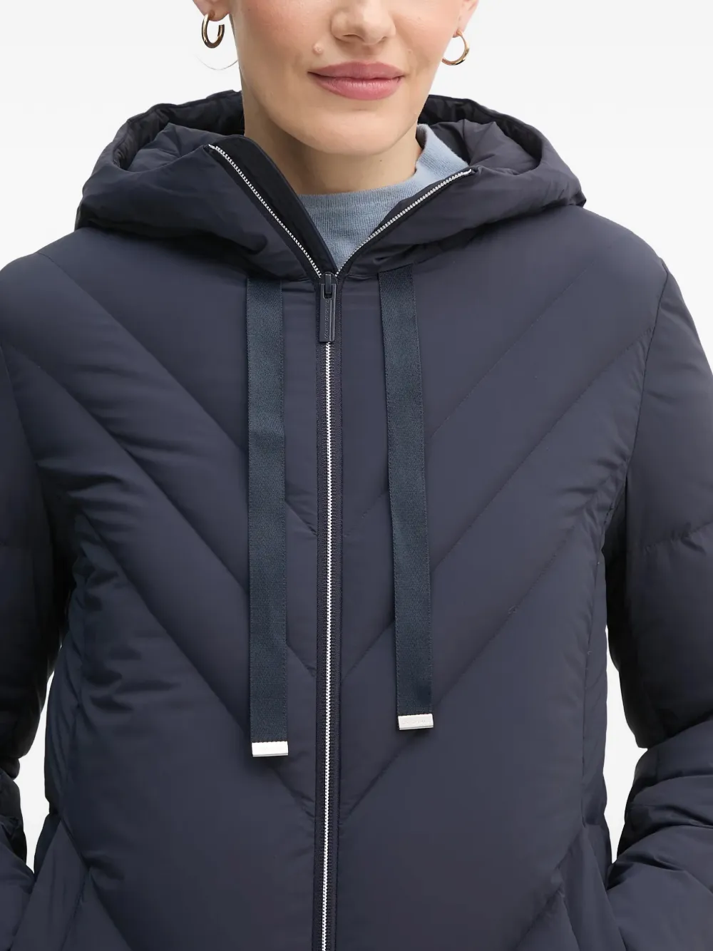 Темно-серый цвет, стеганный узор «елочка», капюшон, застежка-молния, однотонный шнурок, нашивка с логотипом