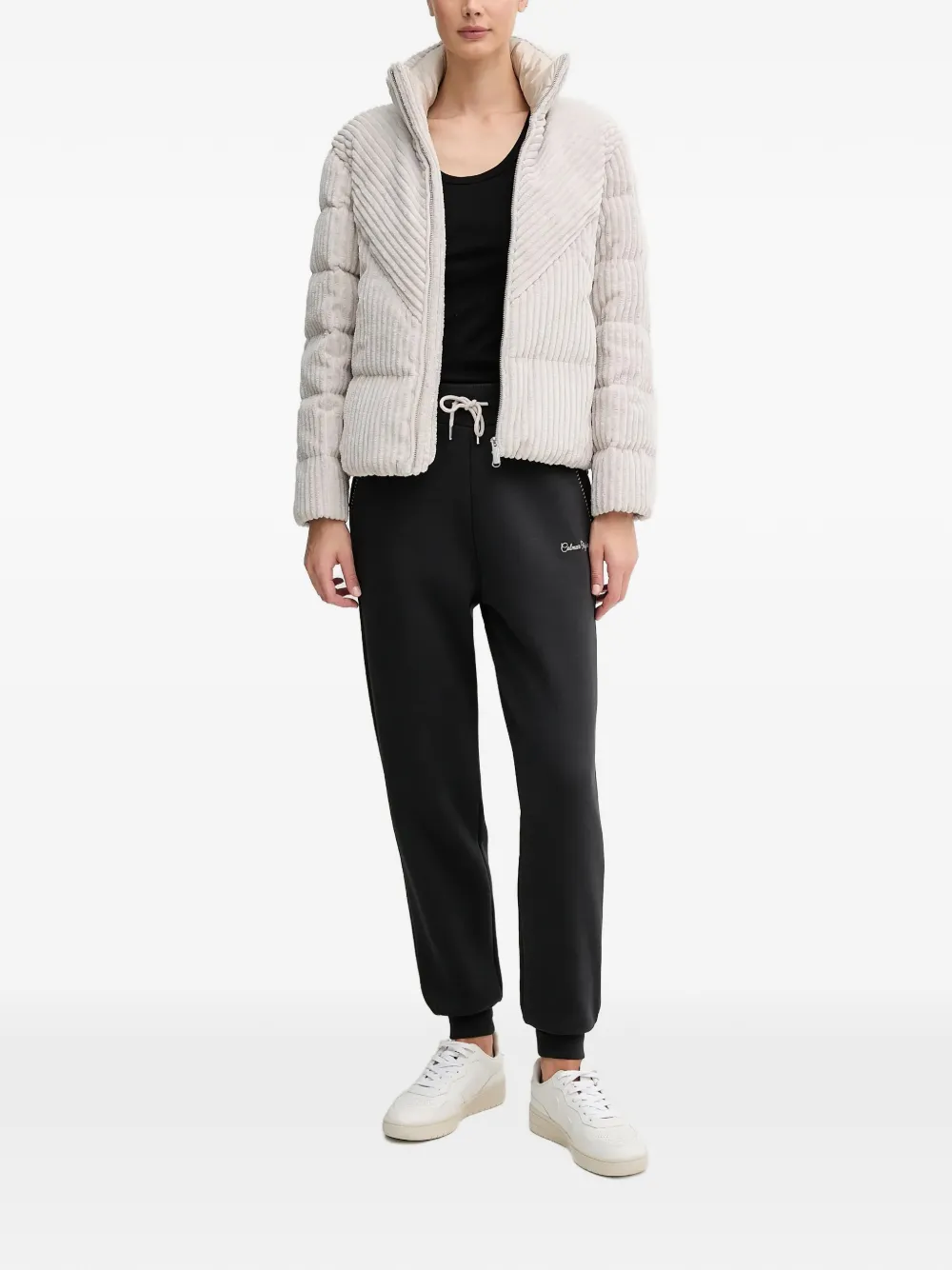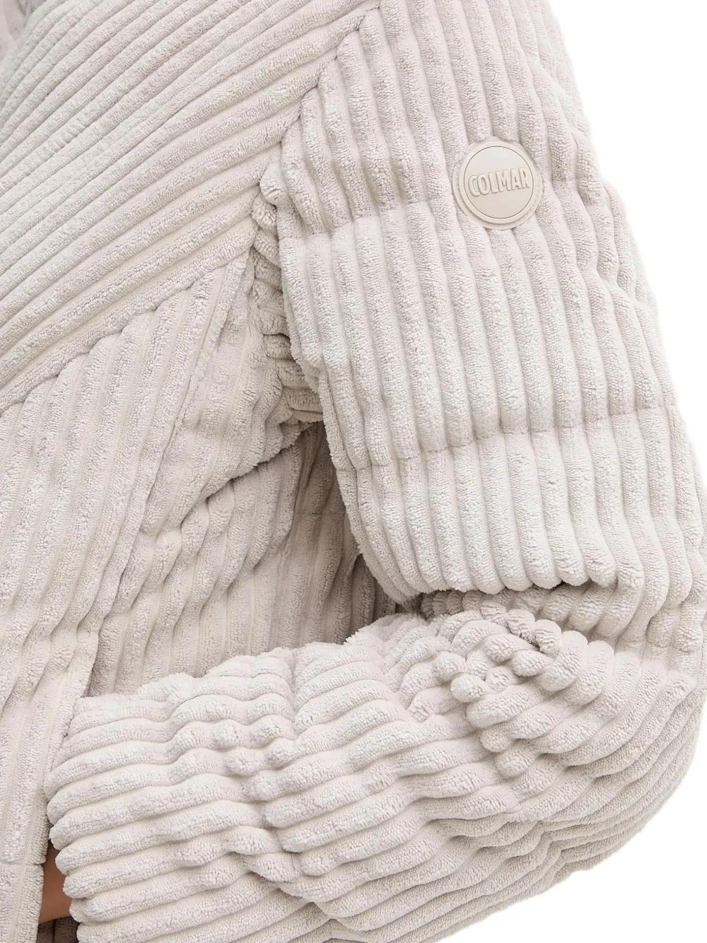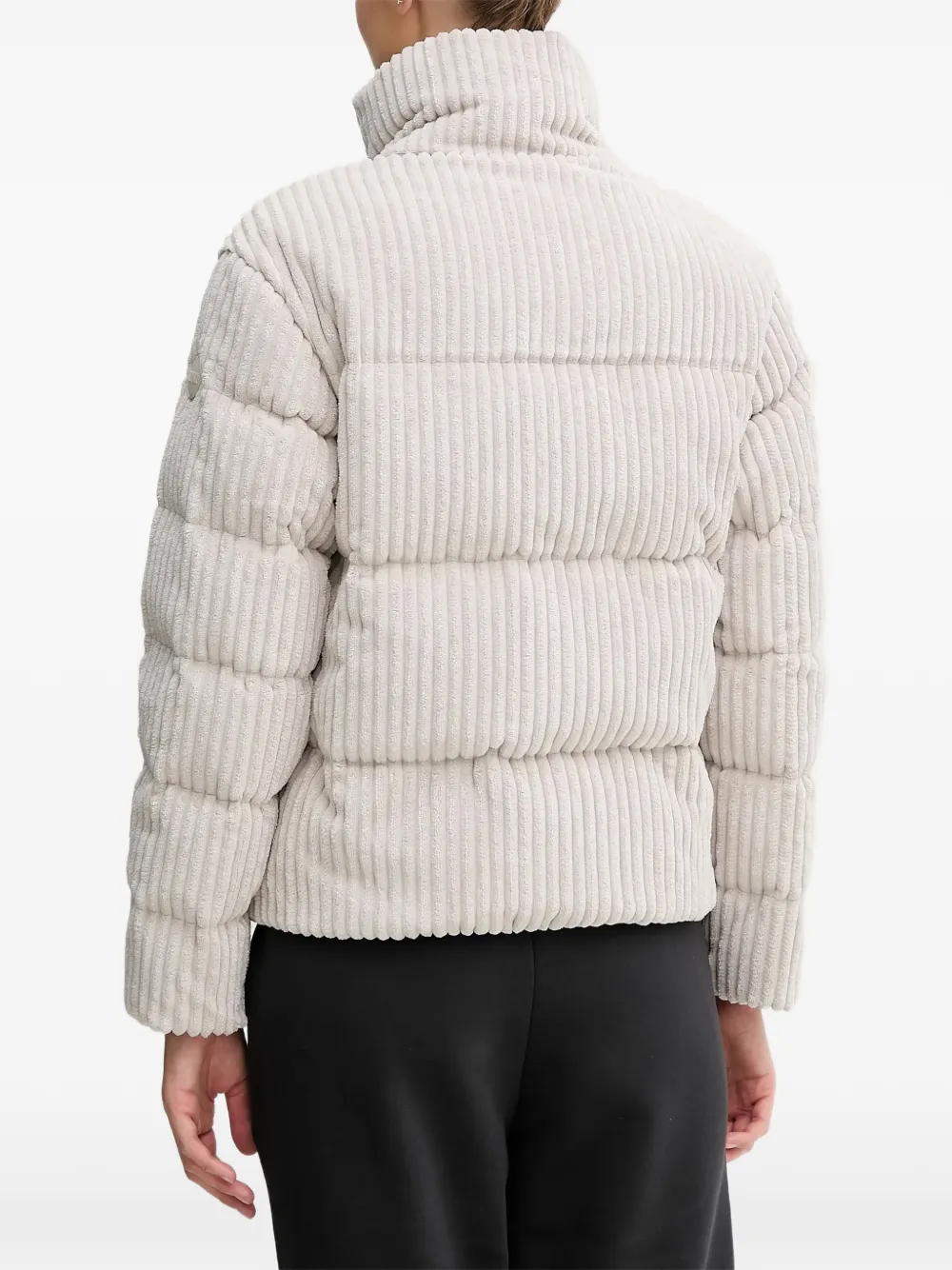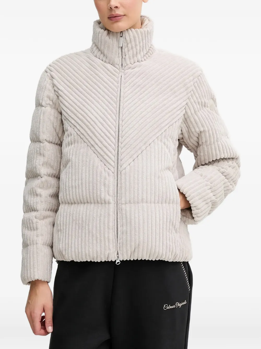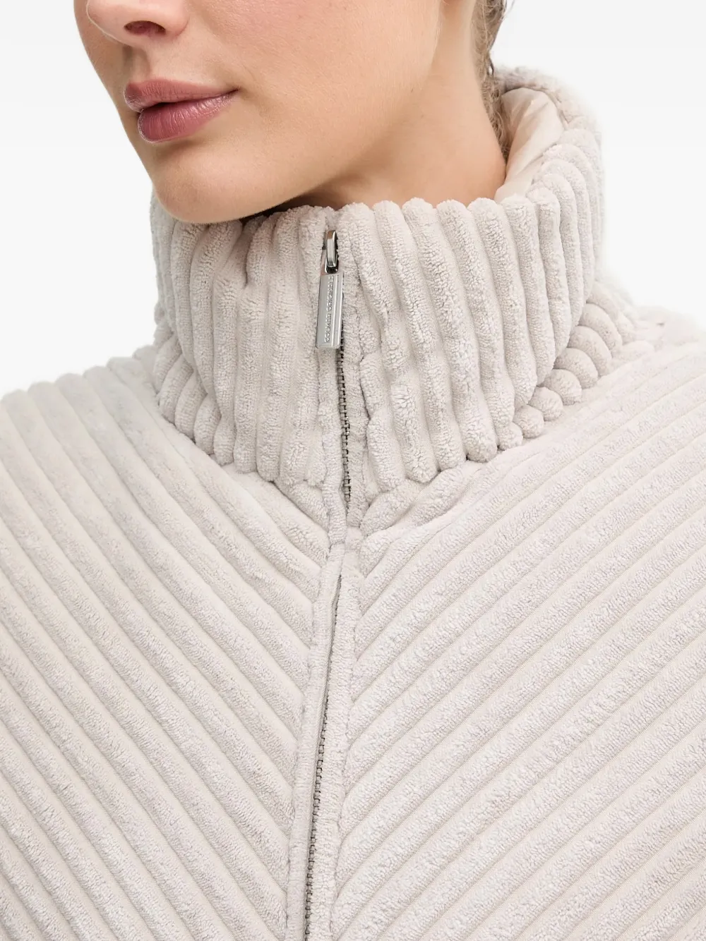 Светло-серая куртка из вельвета с простеганной текстурой, высоким воротником, застежкой-молнией и рубчатым дизайном