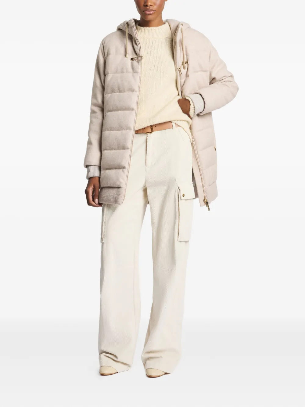 Бежевый цвет, ребристые детали, капюшон, застежка-молния, застежка на кнопки, многослойная конструкция