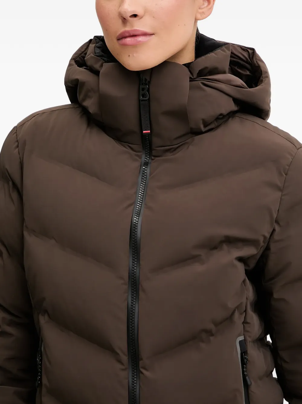 Коричневая стеганая куртка с капюшоном, застежкой-молнией, нашивкой с логотипом и карманами на молнии