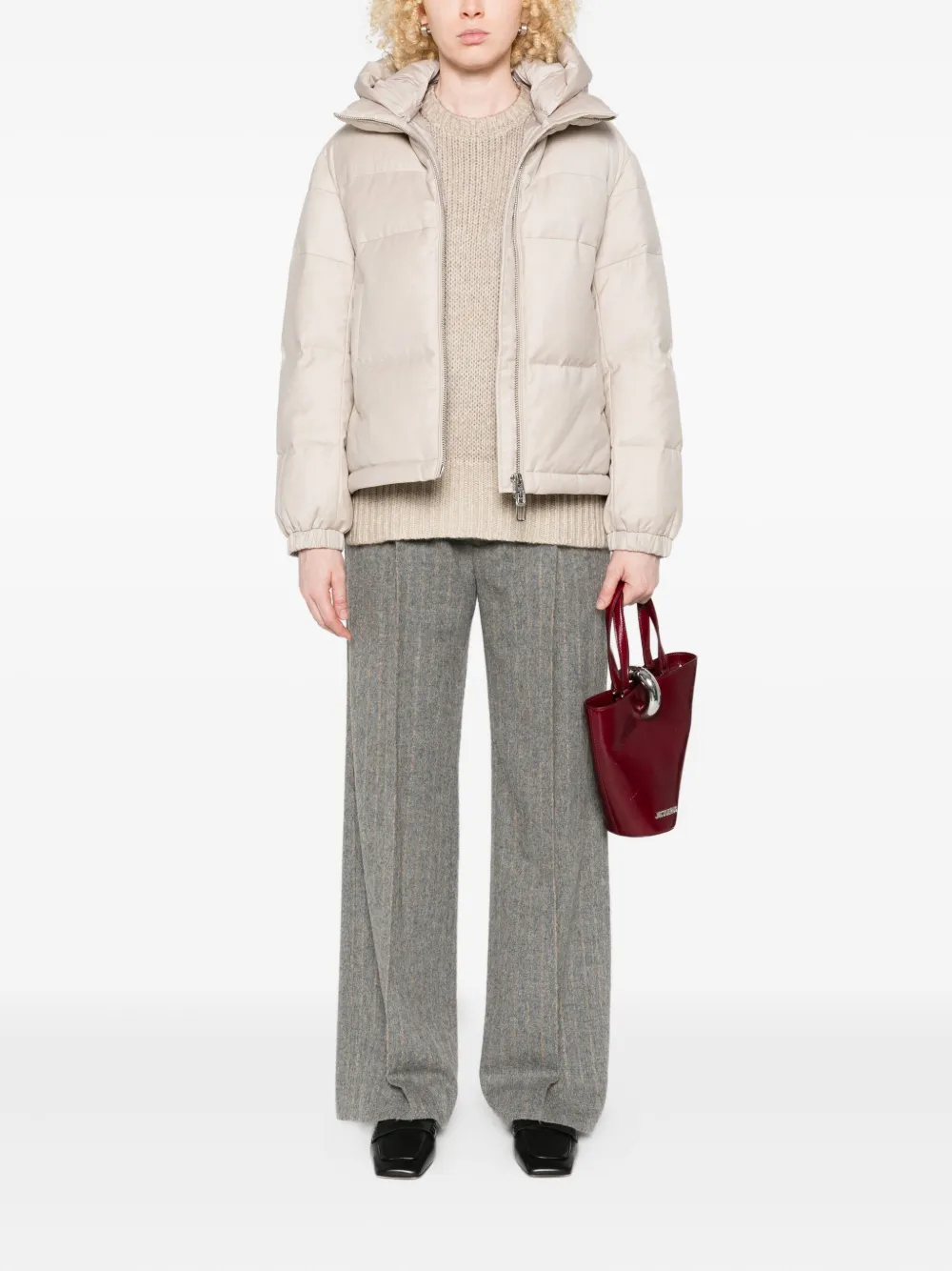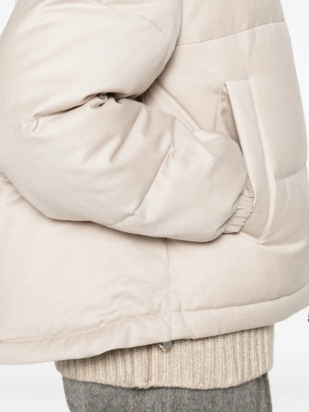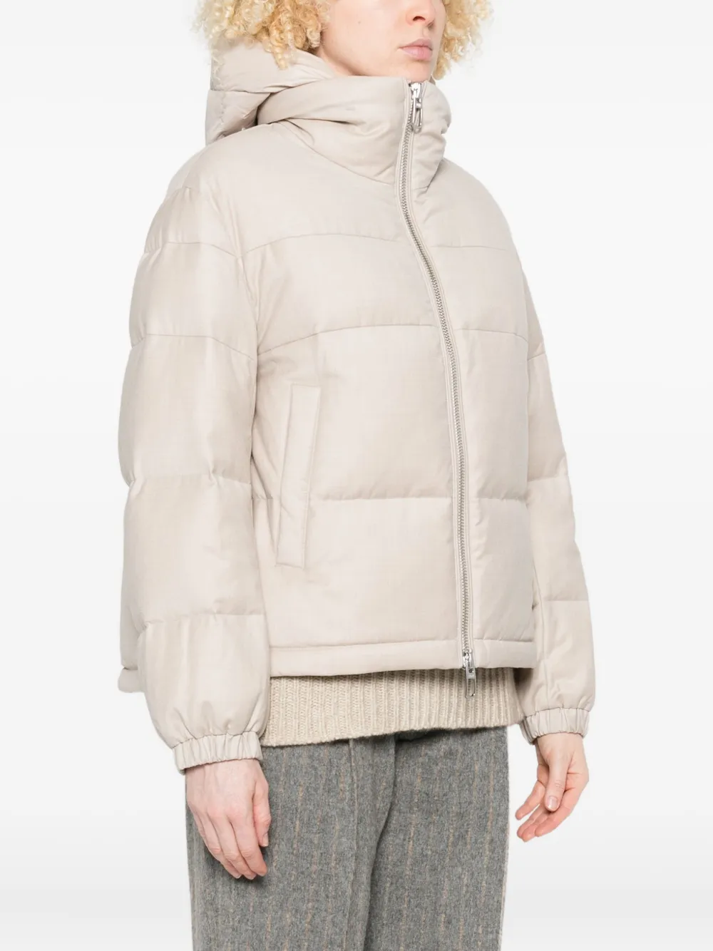 Бежевый стеганый дизайн, капюшон, застежка-молния, прорезные карманы, длинные рукава