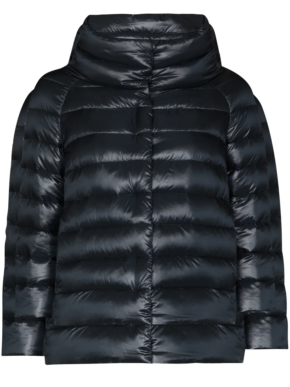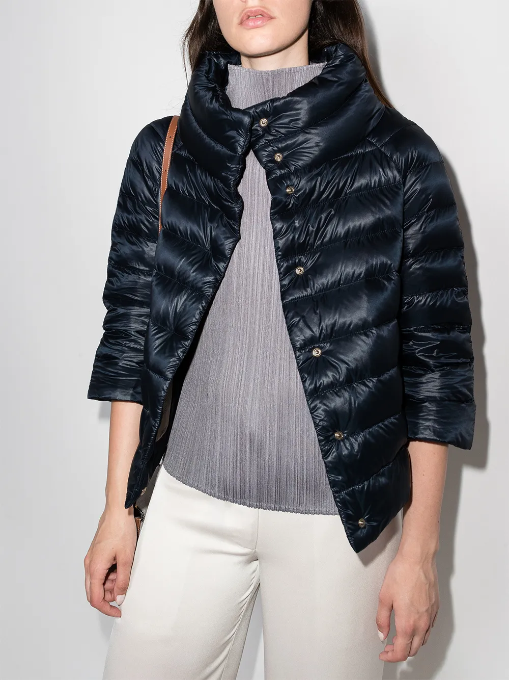 Дутый материал, застежка на кнопках и рукава три четверти.