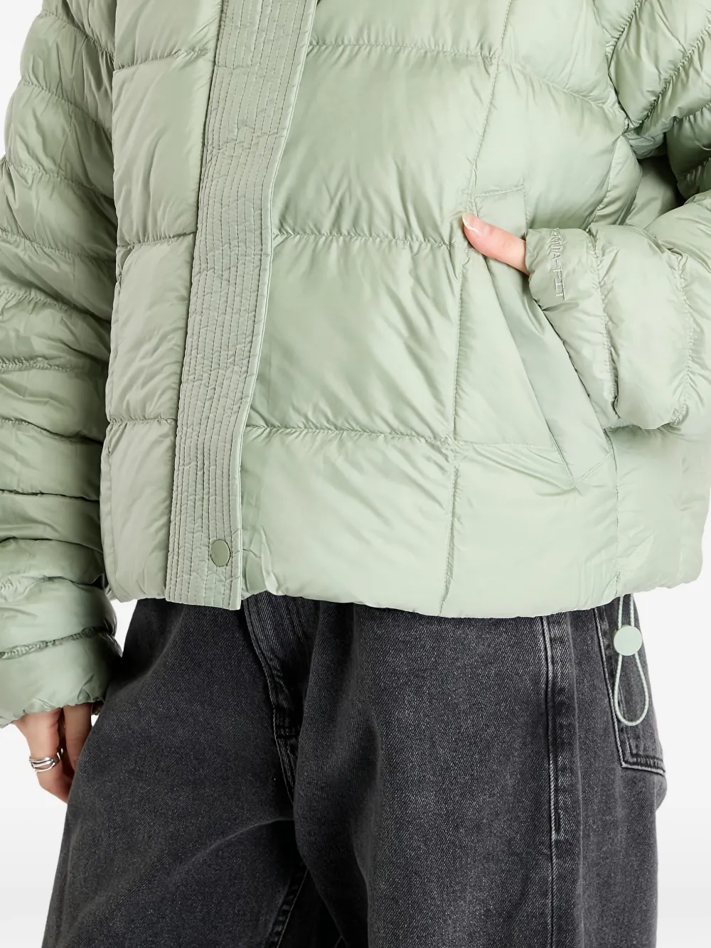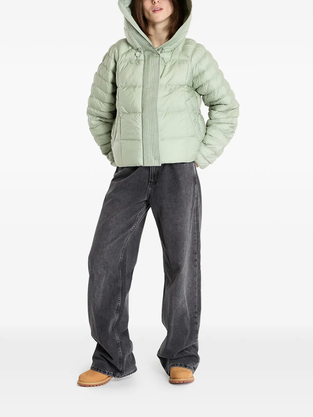 Зеленая стеганая куртка с капюшоном, ребристой отделкой, застежкой на пуговицы спереди и боковыми карманами