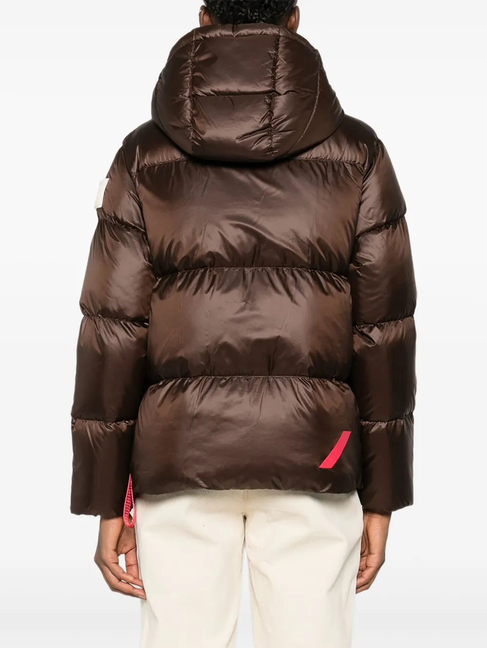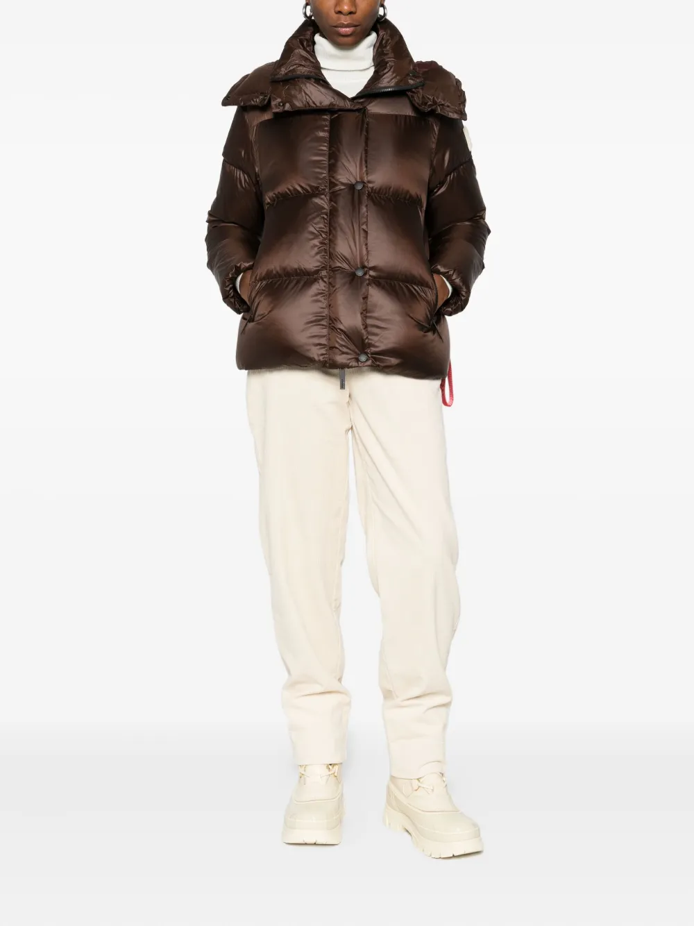 Коричневыйстеганый дизайнкапюшонзастежка на кнопкикарманы на молниидеталь в виде ремешка
